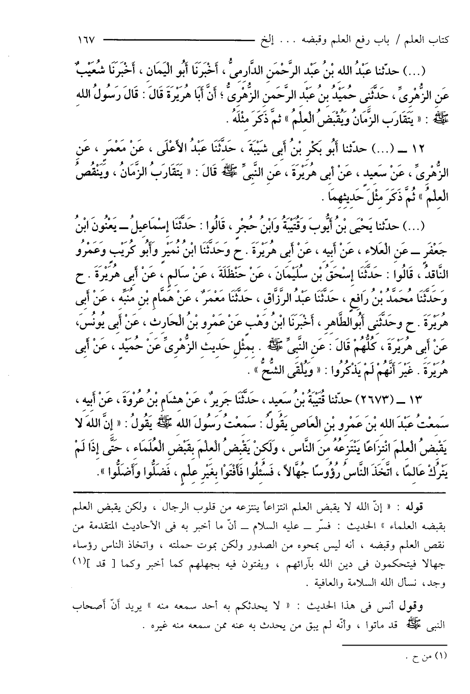 13 - (2673) حدّثنا قُتَيْبَةُ بْنُ سَعِيدٍ، حَدَّثَنَا جَرِيرٌ، عَنْ هِشَامِ بْنُ عُرْوَةَ، عَنْ أَبِيهِ، سَمِعْتُ عَبْدَ اللهِ بْنَ عَمْرِو بْنِ الْعَاصِ يَقُولُ: سَمِعْتُ رَسُولَ اللهِ صَلَّى اللَّهُ عَلَيْهِ وَسَلَّمَ يَقُولُ: " إِنَّ اللهَ لا يَقْبِضُ الْعِلْمَ انْتِزَاعًا يَنْتَزِعُهُ مِنَ النَّاس، وَلَكِنْ يَقْبِضُ الْعِلْمَ بِقَبْضِ الْعُلَمَاءِ، حَتَّى إِذَا لَمْ يَتْرُكْ عَالِمًا، اتَّخَذَ النَّاسُ رُؤُوسًا جُهَّالاً، فَسُئِلُوا فَأَفْتَوْا بِغَيْرِ عِلْمٍ، فَضَلُّوا وَأَضَلُّوا ".