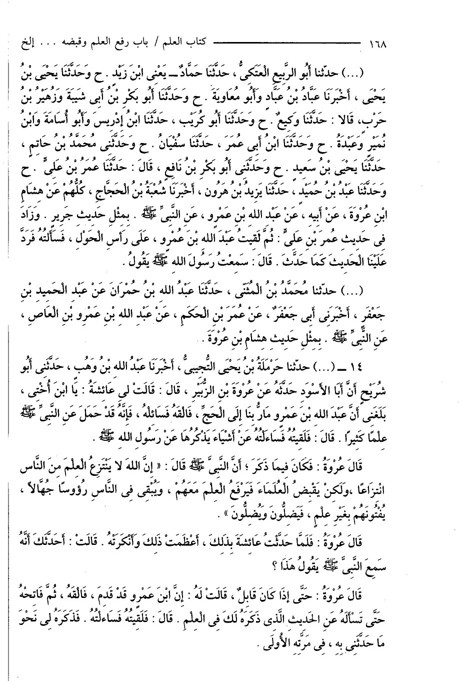 قَالَ عُرْوَةُ: فَكَانَ فِيمَا ذَكَرَ؛ أَنَّ النَّبِىَّ صَلَّى اللَّهُ عَلَيْهِ وَسَلَّمَ قَالَ: " إِنَّ اللهَ لا يَنْتَزِعُ الْعِلْمَ مِنَ النَّاس انْتِزَاعًا، وَلَكِنْ يَقْبِضُ اَلْعُلَمَاءَ فَيَرْفَعُ الْعِلْمَ مَعَهُمْ، وَيُبْقِى فِى النَّاسِ رُؤوسًا جُهَّالاً، يُفْتُونَهُمْ بِغَيْرِ عِلْمٍ، فَيَضِلُّونَ وَيُضِلُّونَ ".