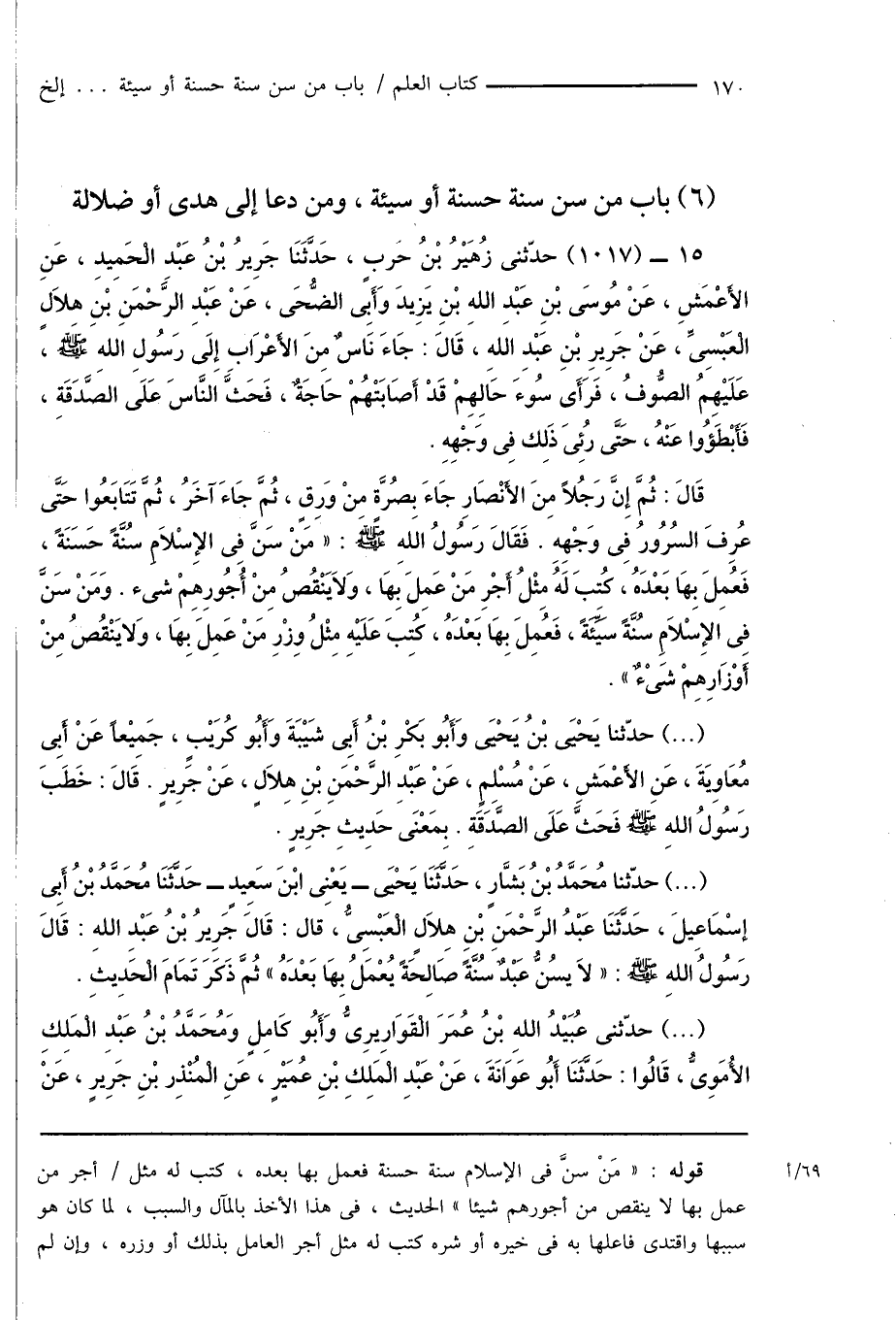 (...) حدّثنا مُحَمَّدُ بْنُ بَشَّارٍ، حَدَّثَنَا يَحْيَى - يَعْنِى ابْنَ سَعِيدٍ - حَدَّثَنَا مُحَمَّدُ بْنُ أَبِى إسْمَاعِيلَ، حَدَّثَنَا عَبْدُ الرَّحْمَنِ بْنِ هِلاَلٍ الْعَبْسِىُّ، قال: قَال جَرِيرُ بْنُ عَبْدِ اللهِ: قَالَ رَسُولُ اللهِ صَلَّى اللَّهُ عَلَيْهِ وَسَلَّمَ: " لاَ يسُنُّ عَبْدٌ سُنَّةً صَالِحَةً يُعْمَلُ بِهَا بَعْدَهُ " ثُمَّ ذَكَرَ تَمَامَ الْحَدِيثِ.