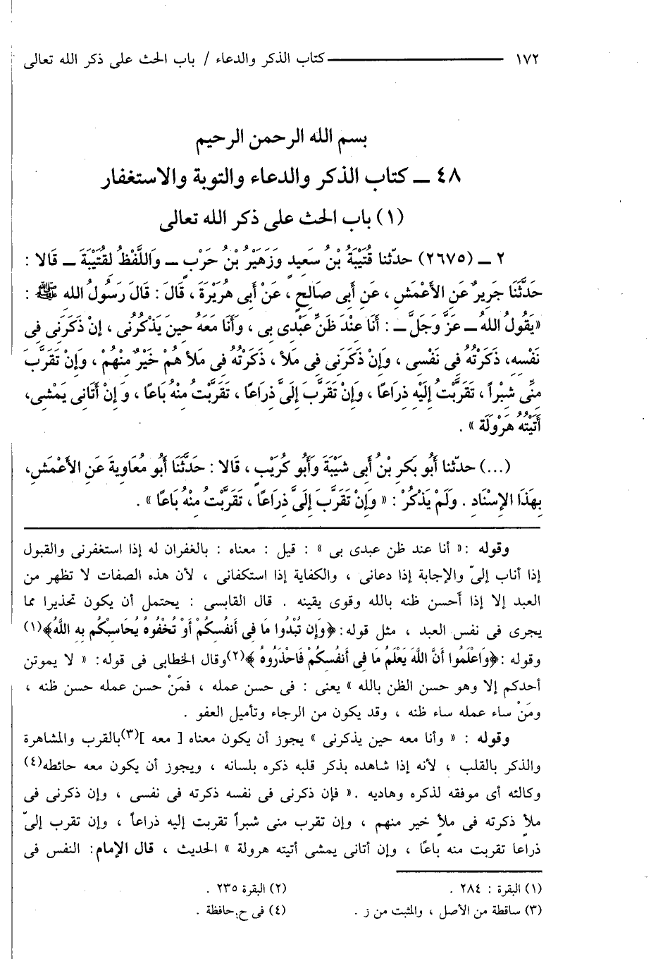 2 - (2675) حدّثنا قُتَيْبَةُ بْنُ سَعِيدٍ وَزهَيْرُ بْنُ حَرْبٍ - وَاللَّفْظُ لِقُتَيْبَةَ - قَالا: حَدَّثَنَا جَرِيرٌ عَنِ الأَعْمَشِ، عَنِ أَبِى صَالِحٍ، عَنْ أَبِى هُرَيْرَةَ، قَالَ: قَالَ رَسُولُ الله صَلَّى اللَّهُ عَلَيْهِ وَسَلَّمَ: " يَقُولُ اللهُ - عَزَّ وَجَلَّ -: أنَا عِنْدَ ظَنِّ عَبْدِى بِى، وَأَنَا مَعَهُ حِينَ يَذْكُرُنى، إنْ ذَكَرَنِى فِى نَفْسِهِ، ذَكَرْتُهُ فِى نَفْسِى، وِإنْ ذَكَرَنِى فِى مَلأ، ذَكَرْتُهُ فِى مَلأَ هُمْ خَيْرٌ مِنْهُمْ، وَإِنْ تَقَرَّبَ مِنِّى شِبْراً، تَقَرَّبْتُ إِلَيْهِ ذِرَاعًا، وَإنْ تَقَرَّبَ إِلَىَّ ذِرَاعًا، تَقَرَّبْتُ مِنْهُ بَاعًا، وَإِنْ أتَانِى يَمْشِى، أًتَيْتُهُ هَرْوَلَة ".