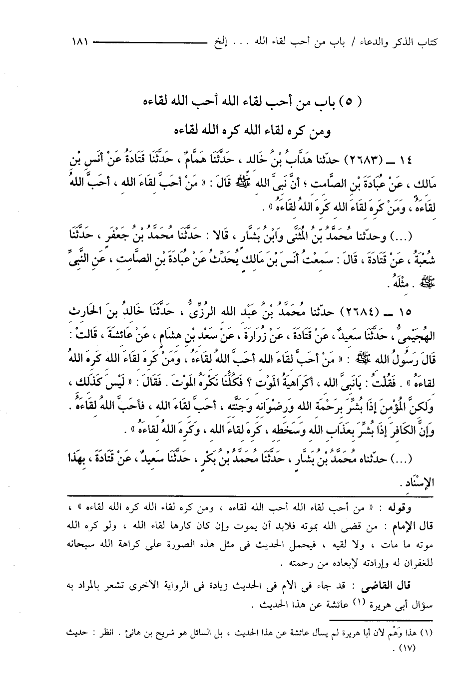 14 - (2683) حدّثنا هَدَّابُ بْنُ خَالِدٍ، حَدَّثَنَا هَمَّامٌ، حَدَّثَنَا قَتَادَةُ عَنْ أنَسِ بْنِ مَالِكٍ، عَنْ عُبَادَةَ بْنِ الصَّامِتِ؛ أنَّ نَبِىَّ اللهِ صَلَّى اللَّهُ عَلَيْهِ وَسَلَّمَ قَالَ: " مَنْ أحَبَّ لِقَاءَ اللهِ، أحَبَّ اللهُ لِقَاَءَهُ، وَمَنْ كَرِهَ لِقَاءَ اللهِ كَرِهَ اللهُ لِقَاءَهُ ".