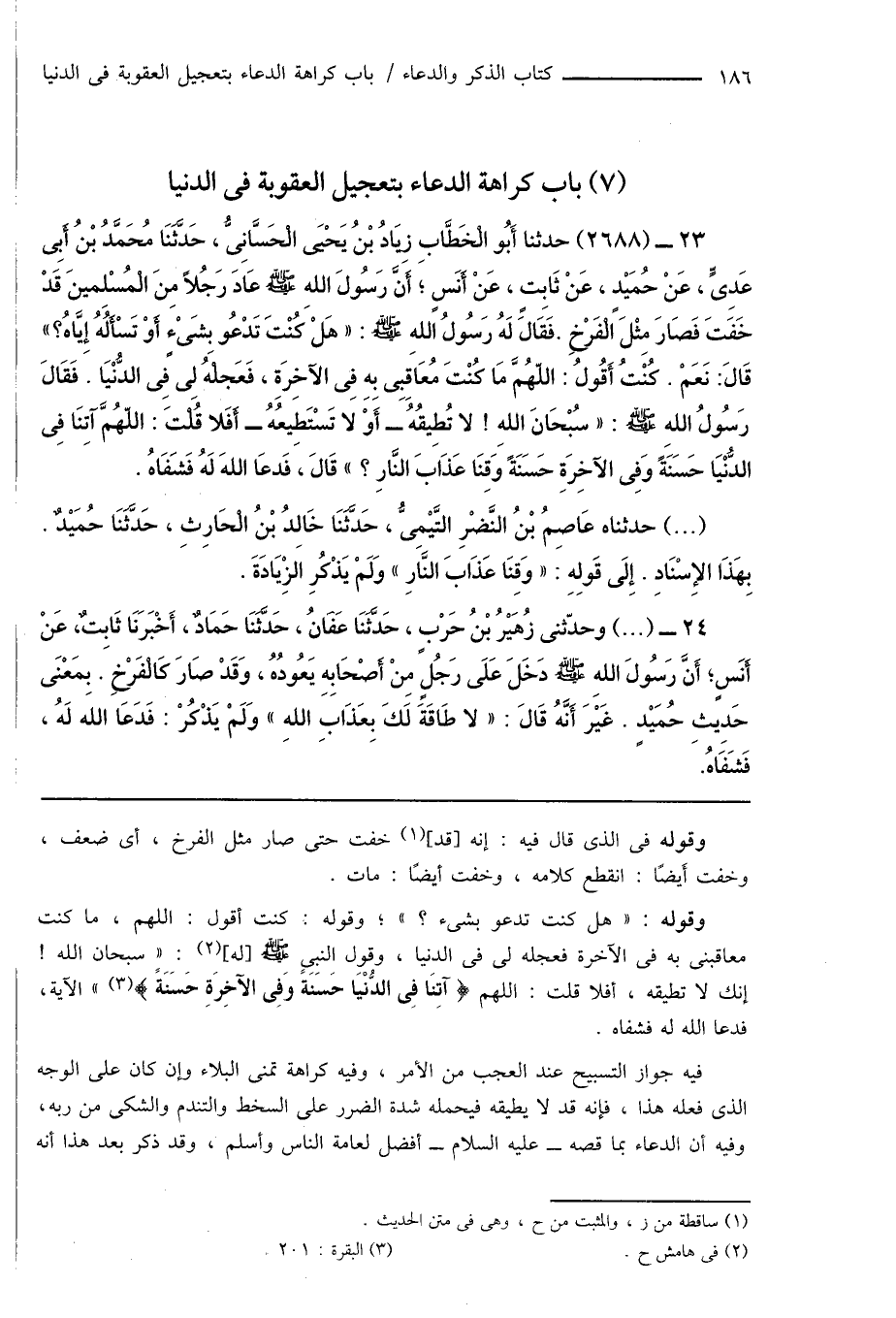 23 - (2688) حدثنا أَبُو الْخَطَّابِ زِيَادُ بْنُ يَحْيَى الْحَسَّانِىُّ، حَدَّثَنَا مُحَمَّدُ بْنُ أَبِى عَدِىٍّ، عَنْ حُمَيْدٍ، عَنْ ثَابِتٍ، عَنْ أنَسٍ؛ أَنَّ رَسُولَ اللهِ صَلَّى اللَّهُ عَلَيْهِ وَسَلَّمَ عَادَ رَجُلاً مِنَ الْمُسْلِمينَ قَدْ خَفَتَ فَصَارَ مِثْلَ الْفَرْخِ. فَقَالَ لَهُ رَسُولُ الله صَلَّى اللَّهُ عَلَيْهِ وَسَلَّمَ: " هَلْ كُنْتَ تَدْعُو بِشَىْءٍ أَوْ تَسْأَلُهُ إِيَّاهُ؟ " قَالَ: نَعَمْ. كُنْتُ أَقُولُ: اللَّهُمَّ مَا كُنْتَ مُعَاقَبِى بِهِ فِى الآخِرَةِ، فَعَجلْهُ لِى فِى الدُّنْيَا. فَقَالَ رَسُولُ اللهِ صَلَّى اللَّهُ عَلَيْهِ وَسَلَّمَ: " سُبْحَانَ اللهِ! لا تُطِيقُهُ - أَوْ لا تَسْتَطِيعُهُ - أَفَلا قُلْتَ: اللهُمَّ آتِنَا فِى الدُّنْيَا حَسَنَةً وَفِى الآخِرَةِ حَسَنَةً وَقِنَا عَذَابَ النَّارِ؟ " قَالَ، فَدعَا اللهَ لَهُ فَشَفَاهُ.