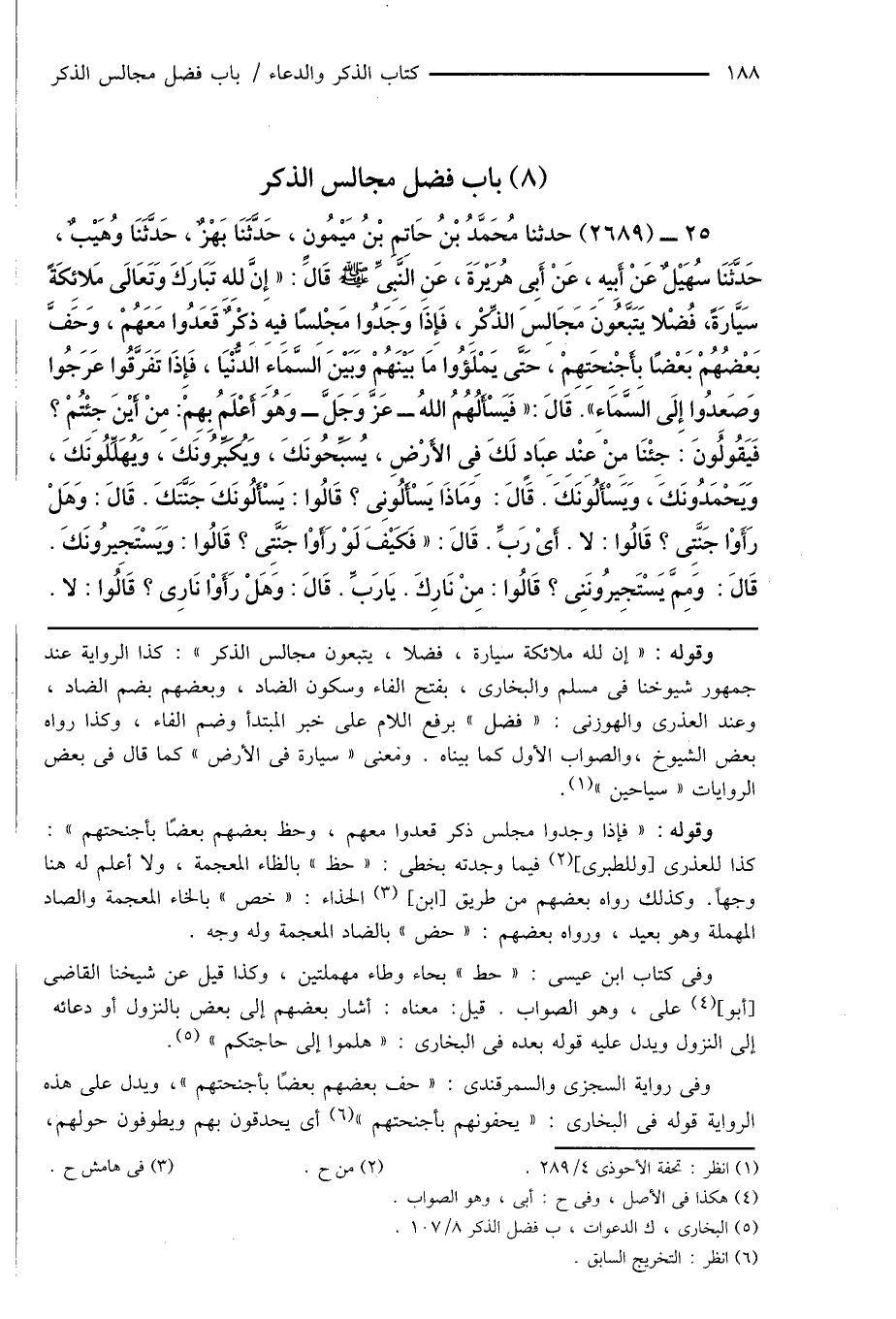 25 - (2689) حدثنا مُحَمَّدُ بْنُ حَاتِمٍ بْنُ مَيْمُونٍ، حَدَّثَنَا بَهْزٌ، حَدَّثَنَا وُهَيْبٌ، حَدَّثَنَا سُهَيْلٌ عَنْ أَبِيهِ، عَنْ أَبِى هُرَيْرَةَ، عَنِ النَّبِىِّ صَلَّى اللَّهُ عَلَيْهِ وَسَلَّمَ قَالَ: " إِنَّ للِهِ تَبَارَكَ وَتَعَالَى مَلائِكَةً سَيَّارَةً، فُضْلا يَتَبَّعُونَ مَجَالِسَ الذِّكْرِ، فَإِذَا وَجَدُوا مَجْلِسًا فِيهِ ذِكْرٌ قَعَدُوا مَعَهُمْ، وَحَفَّ بَعْضُهُمْ بَعْضًا بِأَجْنِحَتِهِمْ، حَتَّى يَمْلَؤُوا مَا بَيْنَهُمْ وَبَيْنَ السَّمَاءِ الدُّنْيَا، فَإِذَا تَفَرَّقُوا عَرَجُوا وَصَعِدُوا إِلَى السَّمَاءِ ". قَالَ: " فَيَسْأَلُهُمُ اللهُ - عَزَّ وَجَلَّ - وَهُوَ أَعْلَمُ بِهِمْ: مِنْ أَيْنَ جِئْتُمْ؟ فَيَقُولُونَ: جِئْنَا مِنْ عِنْدِ عِبَادٍ لَكَ فِى الأَرْضِ، يُسَبِّحُونَكَ، وَيُكَبِّرُونَكَ، وَيُهَلِّلُونَكَ، وَيَحْمَدُونَكَ، وَيَسْأَلُونَكَ. قَالَ: وَمَاذَا يَسْأَلُونِى؟ قَالُوا: يَسْأَلُونَكَ جَنَّتَكَ. قَالَ: وَهَلْ رَأَوْا جَنَّتِى؟ قَالُوا: لا. أىْ رَبِّ. قَالَ: " فَكَيْفَ لَوْ رَأَوْا جَنَّتِى؟ قَالُوا: وَيَسْتَجِيرُونَكَ. قَالَ: وَمِمَّ يَسْتَجِيرُونَنِى؟ قَالُوا: مِنْ نَارِكَ. يَارَبِّ. قَالَ: وَهَلْ رَأَوْا نَارِى؟ قَالُوا: لا.