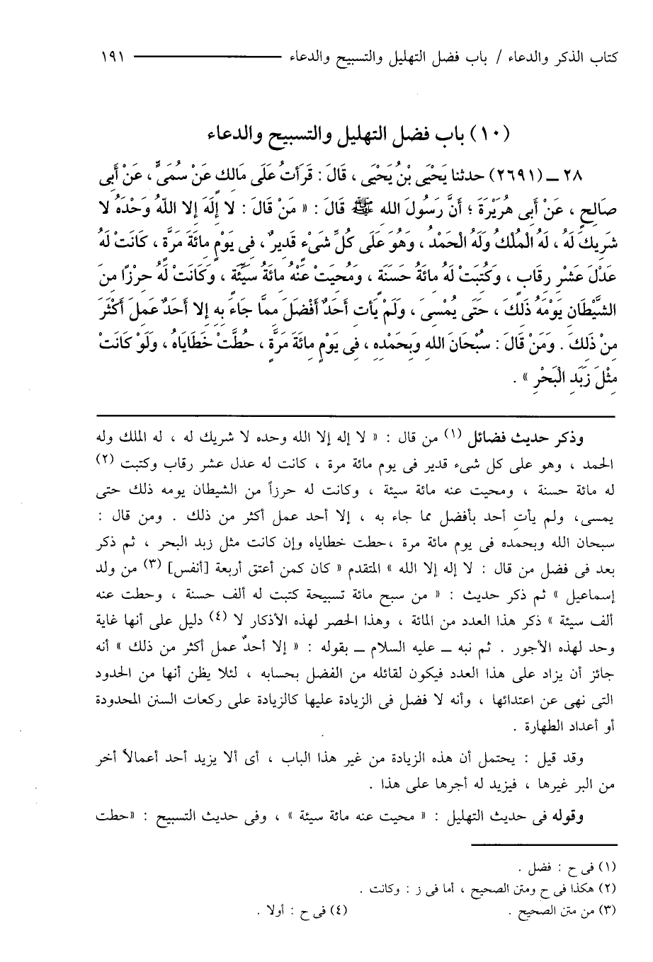 28 - (2691) حدثنا يَحْيَى بْنُ يَحْيَى، قَالَ: قَرَأتُ عَلَى مَالِكٍ عَنْ سُمَىٍّ، عَنْ أَبِى صَالِحٍ، عَنْ أَبِى هُرَيْرَةَ؛ أَنَّ رَسُولَ اللهِ صَلَّى اللَّهُ عَلَيْهِ وَسَلَّمَ قَالَ: " مَنْ قَالَ: لا إِلَهَ إِلا اللهُ وَحْدَهُ لا شَرِيكَ لَهُ، لَهُ الْمُلْكُ وَلَهُ الْحَمْدُ، وَهُوَ عَلَى كُلِّ شَىْءٍ قَدِيرٌ، فِى يَوْمٍ مِائَةَ مَرَّة، كَانَتْ لَهُ عَدْلَ عَشْرِ رِقَابٍ، وَكُتِبَتْ لَهُ مِائَةُ حَسَنَةٍ، وَمُحِيَتْ عَنْهُ مَائَةُ سَيِّئَةٍ، وَكَانَتْ لَهُ حِرْزًا مِنَ الشَّيْطَانِ يَوْمَهُ ذَلِكَ، حَتَّى يُمْسِىَ، وَلَمْ يَأتِ أَحَدٌ أَفْضَلَ مِمَّا جَاءَ بِهِ إِلا أَحَدٌ عَمِلَ أَكْثَرَ مِنْ ذَلِكَ. وَمَنْ قَالَ: سُبْحَانَ اللهِ وَبِحَمْدِهِ، فِى يَوْمٍ مِائَةَ مَرَّةٍ، حُطَّتْ خَطَايَاهُ، وَلَوْ كَانَتْ مِثْلَ زَبَدِ الْبَحْرِ ".