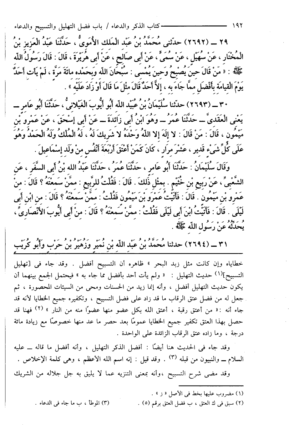 29 - (2692) حدّثنى مُحَمَّدُ بْنُ عَبْدِ الْمَلِكِ الأُمَوِىُّ، حَدَّثَنَا عَبْدُ الْعَزِيزِ بْنُ الْمُخْتَارِ، عَنْ سُهَيْلٍ، عَنْ سُمَىٍّ، عَنْ أَبِى صَالَحٍ، عَنْ أَبِى هُرَيْرَةَ، قَالَ: قَالَ رَسُولُ اللهِ صَلَّى اللَّهُ عَلَيْهِ وَسَلَّمَ: " مَنْ قَالَ حِينَ يُصْبِحُ وَحِينَ يُمْسِى: سُبْحَانَ اللهِ وَبِحَمْدِهِ مِائَةَ مَرَّةٍ، لَمْ يَأتِ أَحَدٌ يَوْمَ الْقِيامَةِ بِأَفْضَلِ مِمَّا جَاءَ بِهِ، إِلاَّ أحَدٌ قَالَ مِثْلَ مَا قَالَ أَوْ زَادَ عَلَيْهِ ".