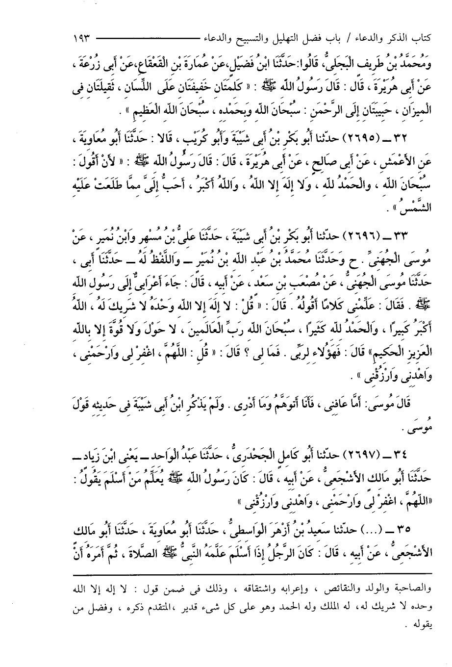 والصاحبة والولد والنقائص، وإعرابه واشتقاقه، وذلك فى ضمن قول: لا إله إلا الله وحده لا شريك له، له الملك وله الحمد وهو على كل شىء قدير، المتقدم ذكره، وفضل من يقوله.