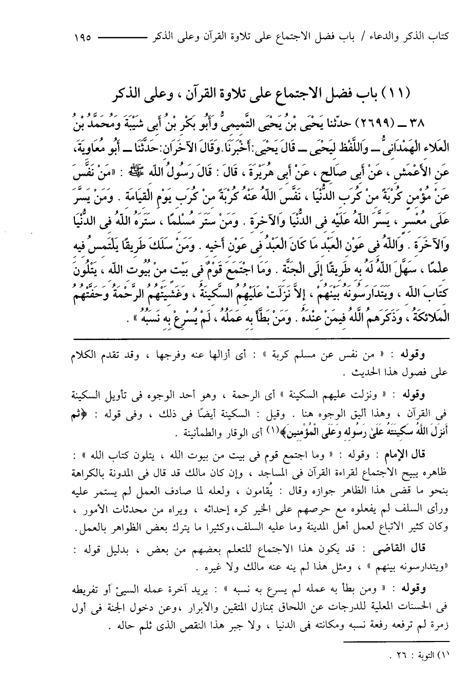 38 - (2699) حدّثنا يَحْيَى بْنُ يَحْيَى التَّمِيمِىُّ وَأَبُو بَكْرِ بْنُ أَبِى شَيْبَةَ وَمُحَمَّدُ بْنُ الْعَلاءِ الْهَمْدَانِىُّ - وَاللَّفْظ لِيَحْيَى - قَالَ يَحْيَى: أَخْبَرَنَا. وَقَالَ الآخَرَانِ: حَدَّثَنَا - أَبُو مُعَاوِيَةَ، عَنِ الأَعْمَشِ، عَنْ أَبِى صَالِح، عَنْ أَبِى هُرَيْرَةَ، قَالَ: قَالَ رَسُولُ اللهِ صَلَّى اللَّهُ عَلَيْهِ وَسَلَّمَ: "مَنْ نَفَّسَ عَنْ مُؤْمِنٍ كُرْبَةً مِنْ كُرَبِ الدُّنْيَا، نَفَّسَ اللهُ عَنْهُ كُرْبَةً مِنْ كُرَبِ يَوْمِ الْقِيَامَةِ. وَمَنْ يَسَّرَ عَلَى مُعْسِرٍ، يَسَّرَ اللهُ عَلَيْهِ فِى الدُّنْيَا وَالآخِرَةِ. وَمَنْ سَتَرَ مُسْلِمًا، سَتَرَهُ اللهُ فِى الدُّنْيَا وَالآخِرَة. وَاللهُ فِى عَوْنِ الْعَبْدِ مَاكَانَ الْعَبْدُ فِى عَوْنِ أَخِيهِ. وَمَنْ سَلَكَ طَرِيقًا يَلْتَمِسُ فِيهِ عِلْمًا، سَهَّلَ اللهُ لَهُ بِهِ طَرِيقًا إِلَى الْجَنَّةِ. وَمَا اجْتَمَعَ قَوْمٌ فِى بَيْتٍ مِنْ بُيُوتِ اللهِ، يَتْلُوَنَ كِتَابَ اللهِ، وَيَتَدَارَسُونَهُ بَيْنَهُمْ، إِلاَّ نَزَلَتْ عَلَيْهُمُ السَّكِينَةُ، وَغَشِيَتْهُمُ الرَّحْمَةُ وَحَفَّتْهُمُ الْمَلائكَةُ، وَذَكَرَهمُ اللَّهُ فِيمَنْ عِنْدَهُ. وَمَنْ بَطَّأَ بِهِ عَمَلُهُ، لَمْ يُسْرِعْ بِهِ نَسَبُهُ ".