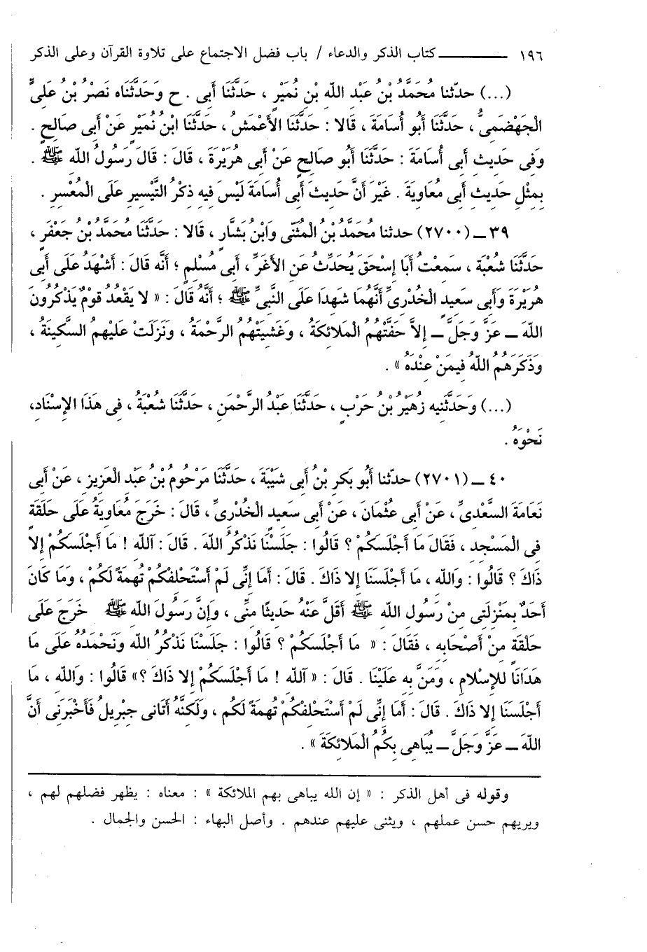 40 - (2701) حدّثنا أَبُو بَكرِ بْنُ أَبِى شَيْبَةَ، حَدَّثَنَا مَرْحُومُ بْنُ عَبْدِ الْعَزِيزِ، عَنْ أَبِى نَعَامَةَ السَّعْدِىِّ، عَنْ أَبِى عُثْمَانَ، عَنْ أَبِى سَعِيدٍ الْخُدْرِىِّ، قَالَ: خَرَجَ مُعَاوِيَةُ عَلَى حَلَقَةٍ فِى الْمَسْجِدِ، فَقَالَ مَا أَجْلَسَكُمْ؟ قَالُوا: جَلَسْنَا نَذْكُرُ اللهَ. قَالَ: آللهِ! مَا أَجْلَسَكُمْ إِلا ذَاكَ؟ قَالُوَا: وَاللهِ، مَا أَجْلَسَنَا إِلا ذَاكَ. قَالَ: أَمَا إنِّى لَمْ اسْتَحْلِفْكُمْ تُهمَةً لَكُمْ، وَمَا كَانَ أَحَدٌ بِمَنْزِلَتِى مِنْ رَسُولِ اللهِ صَلَّى اللَّهُ عَلَيْهِ وَسَلَّمَ أَقَلَّ عَنْهُ حَدِيثًا مِنِّى، وَإِنَّ رَسُولَ اللهِ صَلَّى اللَّهُ عَلَيْهِ وَسَلَّمَ خَرَجَ عَلَى حَلْقَةٍ مِنْ أَصْحَابِهِ، فَقَالَ. " مَا أَجْلَسَكُمْ؟ قَالُوا: جَلَسْنَا نَذْكُرُ الله وَنَحْمَدُهُ عَلَى مَا هَدَانَا للإِسْلامِ، وَمَنَّ بِهِ عَلَيْنَا. قَالَ: " آللهِ! مَا أَجْلَسَكُمْ إِلا ذَاكَ؟ " قَالُوا: وَاللهِ، مَا أَجْلَسَنَا إلا ذَاكَ. قَالَ: أَمَا إِنِّى لَمْ أَسْتَحْلِفْكُمْ تُهمَةً لَكُم، وَلَكِنَّهُ أَتَانى جِبْرِيلُ فَأَخْبَرَنِى أَنَّ اللهَ - عَزَّ وَجَلَّ - يُبَاهِى بِكُمُ الْمَلائِكَةَ ".