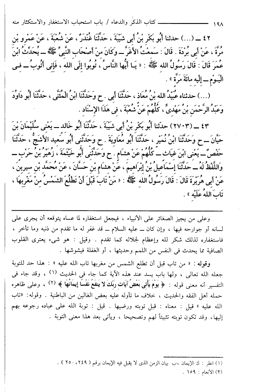 42 - (...) حدثنا أَبُو بَكْرِ بْنُ أَبِى شَيْبَةَ، حَدَّثَنَا غُنْدَرٌ، عَنْ شُعْبَةَ، عَنْ عَمْرِو بْنِ مُرَّةَ، عَنْ أَبِى بُرْدَةَ. قَالَ: سَمِعْتُ الأَغَرَّ - وَكَانَ مِنْ أَصْحَابِ النَّبِىِّ صَلَّى اللَّهُ عَلَيْهِ وَسَلَّمَ - يُحَدِّثُ ابْنَ عُمَرَ قَالَ: قَالَ رَسُولُ اللهِ صَلَّى اللَّهُ عَلَيْهِ وَسَلَّمَ: " يَا أَيُّها النَّاسُ، تُوبُوا إِلَى اللهِ، فَإِنِى أَتُوبُ - فِى الْيَوْمِ - إِلْيهِ مِائَةَ مَرَّةٍ ".