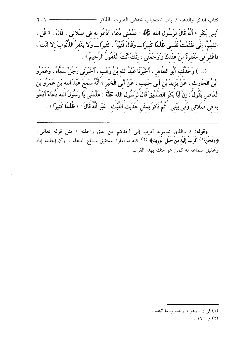 أَبِى بَكْرٍ؛ أَنَّهُ قَالَ لِرَسُول الله صَلَّى اللَّهُ عَلَيْهِ وَسَلَّمَ: عَلِّمْنِى دُعَاء أدْعُو بِهِ فِى صَلاتِى. قَالَ: " قُل: اللهُمَّ، إِنِّى ظَلَمْتُ نَفْسِى ظُلْمًا كَبِيرًا - وَقَالَ قُتَيْبَةُ: كَثِيرًا - وَلا يَغْفِرُ الذُّنُوبَ إِلا أَنْتَ، فاغْفِرْ لِى مَغْفِرَةً مِنْ عِنْدِكَ وَارْحَمْنِى، إِنَّكَ أَنْتَ الْغَفُورُ الرَّحِيمُ ".