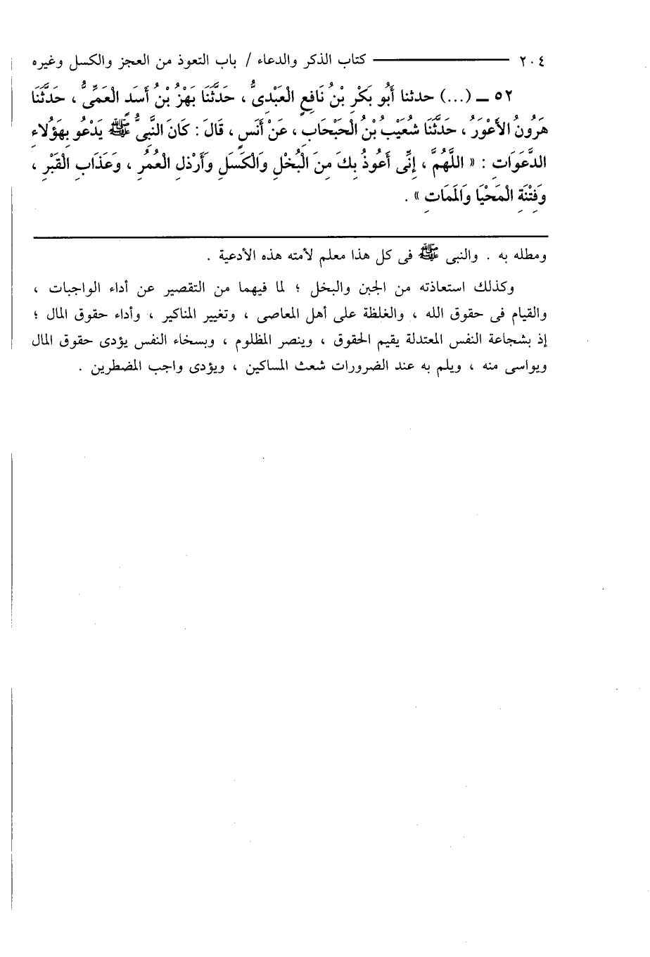 52 - (...) حدثنا أَبُو بَكْرِ بْنُ نَافِعٍ الْعَبْدِىُّ، حَدَّثَنَا بَهْزُ بْنُ أَسَدٍ الْعَمِّىُّ، حَدَّثَنَا هَارُونُ الأَعْوَرُ، حَدَّثَنَا شُعَيْبُ بْنُ الْحَبْحَابِ، عَنْ أَنَسٍ، قَالَ: كَانَ النَّبِىُّ صَلَّى اللَّهُ عَلَيْهِ وَسَلَّمَ يَدْعُو بِهَؤُلاءِ الدَّعَوَاتِ: " اللَّهُمَّ، إِنِّى أَعُوذُ بِكَ مِنَ الْبُخْلِ وَالْكَسَلِ وَأَرْذلِ الْعُمُرِ، وَعَذَابِ الْقَبْرِ، وَفِتْنَةِ الْمَحْيَا وَالمَمَاتِ ".