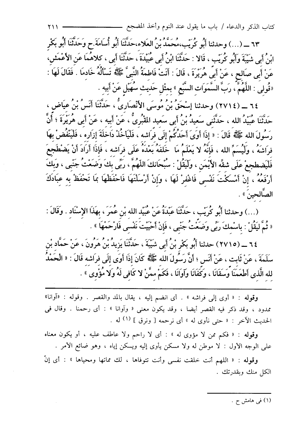 64 - (2715) حدثنا أَبُو بَكْرِ بْنُ أَبِى شَيْبَةَ، حَدَّثَنَا يَزِيدُ بْنُ هَارُونَ، عَنْ حَمَّاد بْنِ سَلَمَةَ، عَنْ ثَابِتٍ، عَنْ أَنَسٍ؛ أَنَّ رَسُولَ الله صَلَّى اللَّهُ عَلَيْهِ وَسَلَّمَ كَانَ إِذَا أَوَى إِلَى فِرَاشِهِ قَالَ: " الْحَمْدُ لِلهِ الَّذِى أَطْعَمَنَا وَسَقَانَا، وَكَفَانَا وآوَانَا، فَكَمْ مِمَّنْ لا كَافِى لَهُ وَلا مُؤْوِى ".