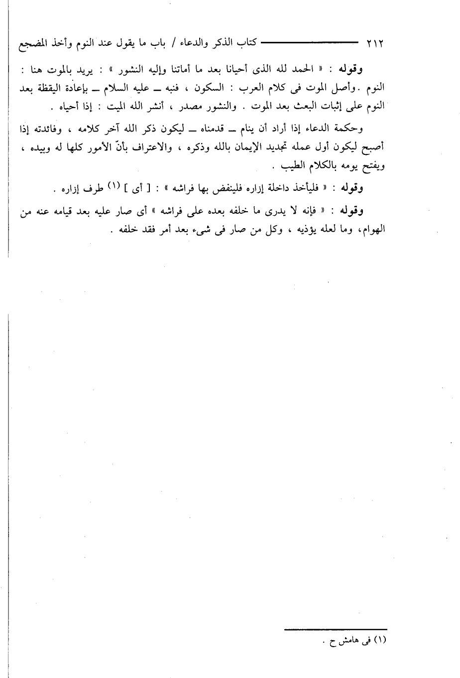 وحكمة الدعاء إذا أراد أن ينام - قدمناه - ليكون ذكر الله آخر كلامه، وفائدته إذا أصبح ليكون أول عمله تجديد الإيمان بالله وذكره، والاعتراف بأنّ الأمور كلها له وبيده، ويفتح يومه بالكلام الطيب.