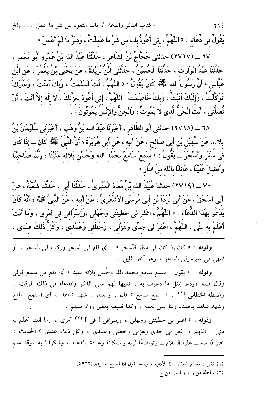 68 - (2718) حدثنى أَبُو الطَّاهِرِ، أَخْبَرَنَا عَبْدُ الله بْنُ وهْبٍ، أَخْبَرَنِى سُلَيْمَانُ بْنُ بِلالٍ، عَنْ سُهَيْلِ بْنِ أَبِى صَالِحٍ، عَنْ أَبِيهِ، عَنِ أَبِى هُرَيْرَةَ؛ أَنَّ النَّبِىَّ صَلَّى اللَّهُ عَلَيْهِ وَسَلَّمَ كَانَ - إِذَا كَانَ فِى سَفَرٍ وَأَسْحَرَ - يَقُولُ: " سَمِعَ سَامِعٌ بِحَمْدِ اللهِ وَحُسْنِ بَلائِهِ عَلَيْنَا، رَبَّنَا صَاحِبْنَا وَأَفْضِلْ عَلَيْنَا، عَائِذًا بِاللهِ مِنَ النَّارِ ".