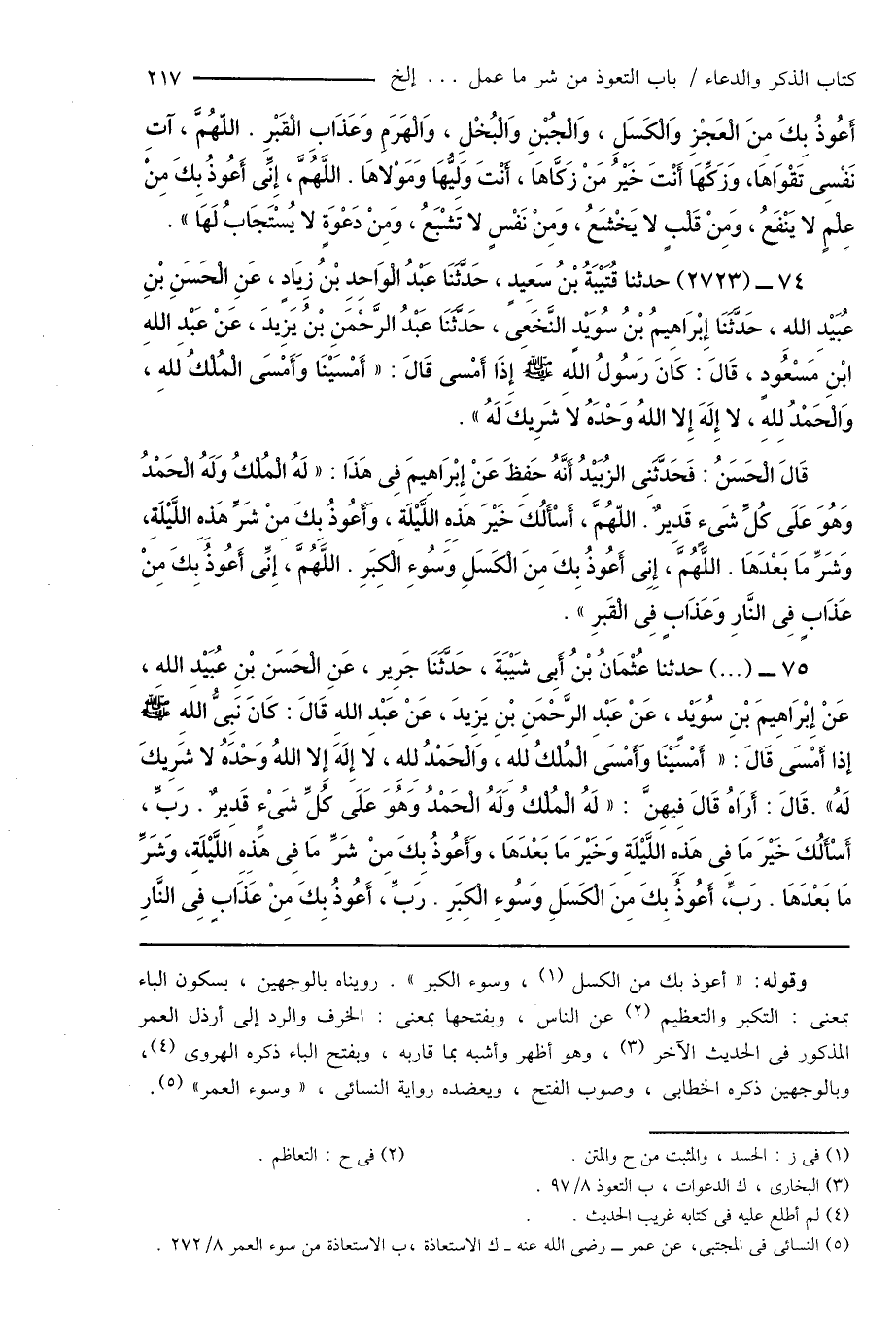 75 - (...) حدثنا عُثْمَانُ بْنُ أَبِى شَيْبَةَ، حَدَّثَنَا جَرِير، عَنِ الْحَسَن بْنِ عُبَيْدِ اللهِ، عَنْ إِبْرَاهِيمَ بْنِ سُوَيْدٍ، عَنْ عَبْدِ الرَّحْمَنِ بْنِ يَزِيدَ، عَنْ عَبْدِ اللهِ قَالَ: كَانَ نَبِىُّ اللهِ صَلَّى اللَّهُ عَلَيْهِ وَسَلَّمَ إذا أَمْسَى قَالَ: " أَمْسَيْنَا وَأَمْسَى الْمُلْكُ للهِ، وَالْحَمْدُ لِلهِ، لا إِلَهَ إِلا اللهُ وَحْدَهُ لا شَرِيكَ لَهُ ". قَالَ: أَرَاهُ قَالَ فِيهِنَّ: " لَهُ الْمُلْكُ وَلَهُ الْحَمْدُ وَهُوَ عَلَى كُلِّ شَىْءٍ قَدِيرٌ. رَبِّ، أَسْأَلُكَ خَيْرَ مَا فِى هَذِهِ اللَّيْلَةِ وَخَيْرَ مَا بَعْدَهَا، وَأَعُوذُ بِكَ مِنْ شَرِّ مَا فِى هَذِهِ اللَّيْلَةِ، وَشَرِّ مَا بَعْدَهَا. رَبِّ، أَعُوذُ بِكَ مِنَ الْكَسَلِ وَسُوءِ الْكِبَرِ. رَبِّ، أَعُوذُ بِكَ مِنْ عَذَابٍ فِى النَّارِ