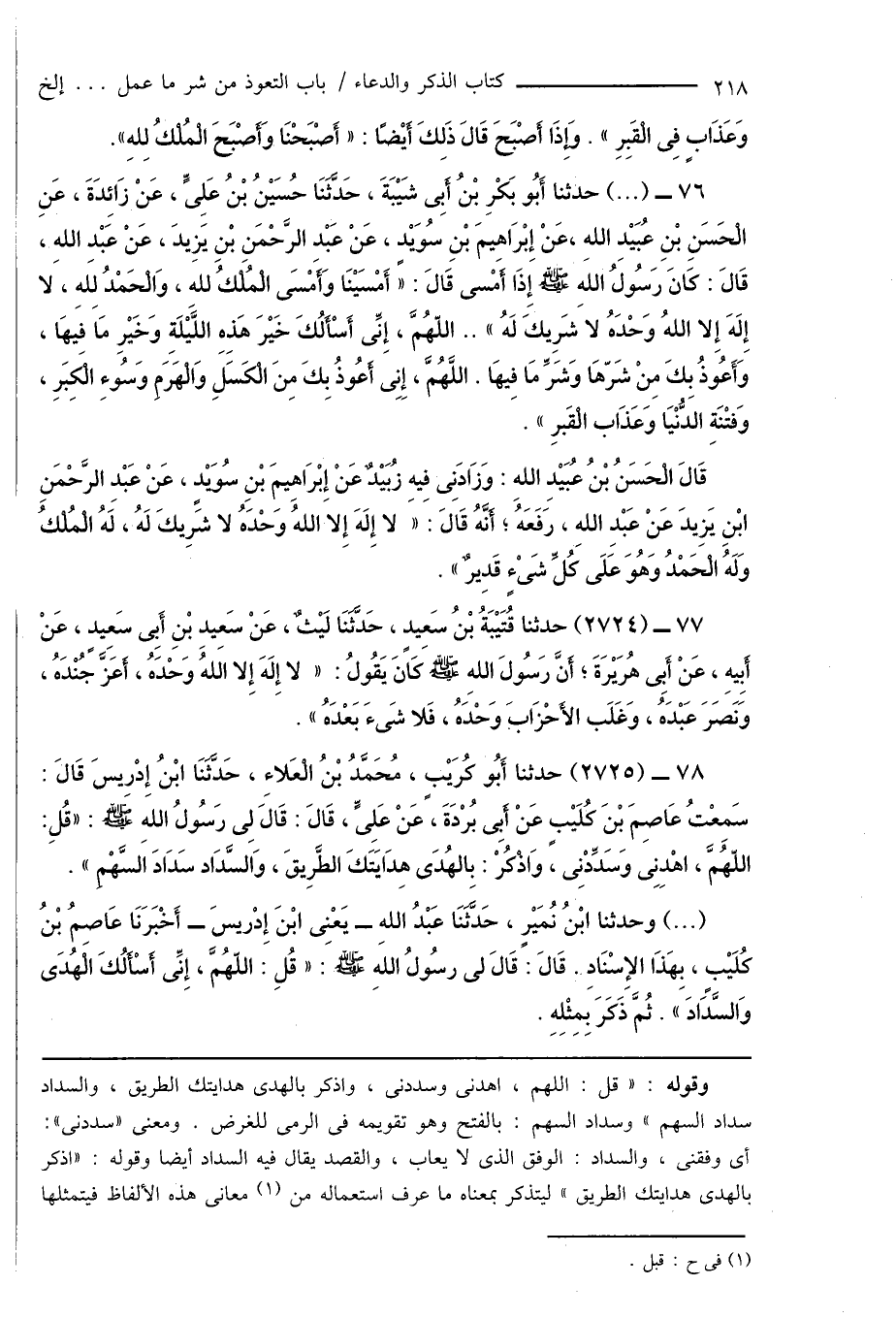 76 - (...) حدثنا أَبُو بَكْرِ بْنُ أَبِى شَيْبَةَ، حَدَّثَنَا حُسَيْنُ بْنُ عَلِىٍّ، عَنْ زَائِدَةَ، عَنِ الْحَسَنِ بْنِ عُبَيْدِ اللهِ، عَنْ إِبْرَاهِيمَ بْنِ سُوَيْدٍ، عَنْ عَبْدِ الرَّحْمَنِ بْنِ يَزِيدَ، عَنْ عَبْدِ اللهِ، قَالَ: كَانَ رَسُولُ اللهِ صَلَّى اللَّهُ عَلَيْهِ وَسَلَّمَ إِذَا أَمْسى قَالَ: " أَمْسَيْنَا وَأَمْسَى الْمُلْكُ للهِ، وَالْحَمْدُ لِلهِ، لا إِلَهَ إِلا اللهُ وَحْدَهُ لا شَرِيكَ لَهُ " .. اللهُمَّ، إِنِّى أَسْأَلُكَ خَيْرَ هَذِهِ اللَّيْلَةِ وَخَيْرِ مَا فِيهَا، وَأَعُوذُ بِكَ مِنْ شَرّهَا وَشَرِّ مَا فِيهَا. اللَّهُمَّ، إِنِّى أَعُوذُ بِكَ مِنَ الْكَسَلِ وَالْهَرَمِ وَسُوءِ الْكِبَرِ، وَفتْنَةِ الدُّنْيَا وَعَذَاب الْقَبرِ ".