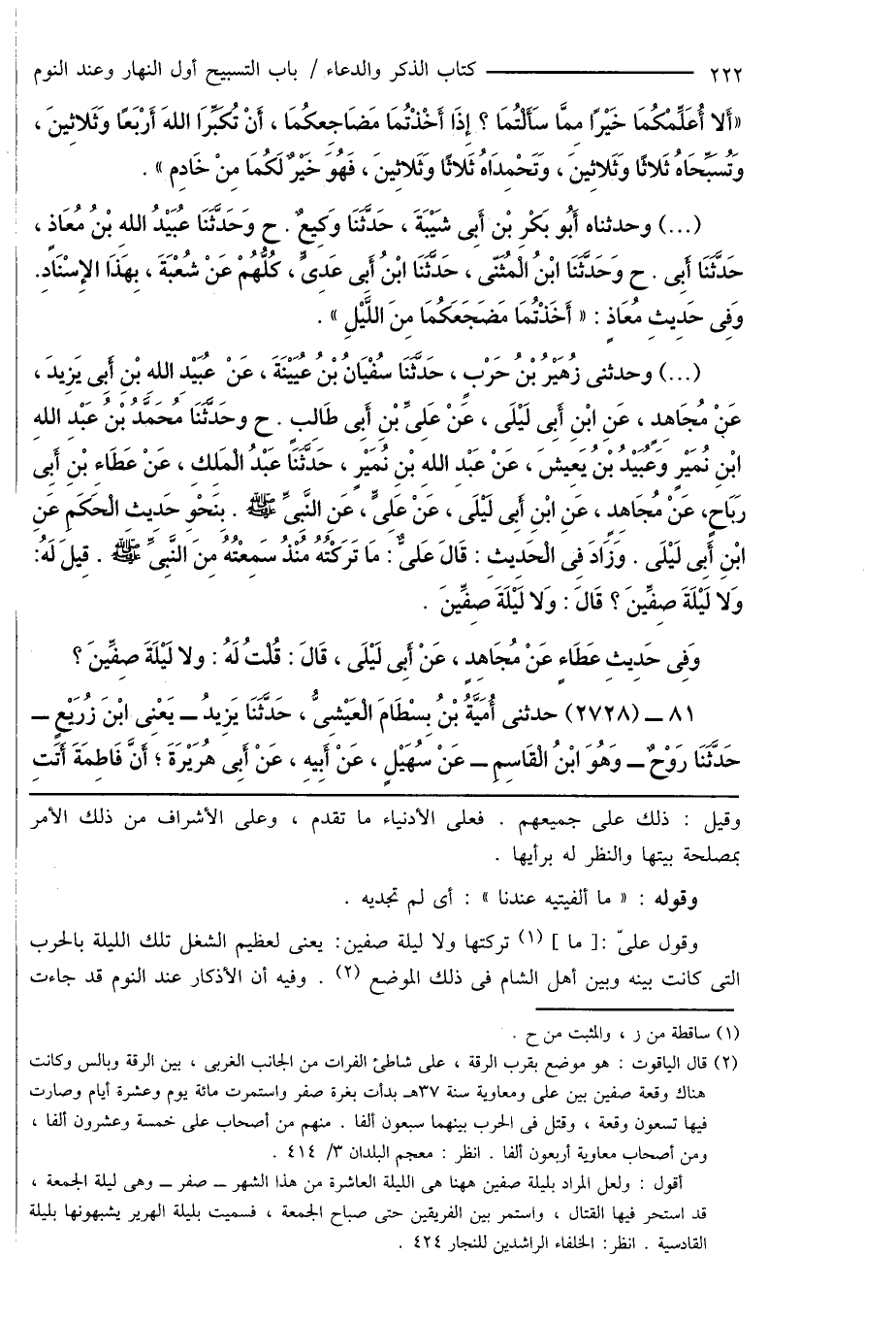 (...) وحدثنى زُهَيْرُ بْنُ حَرْبٍ، حَدَّثَنَا سُفْيَانُ بْنُ عُيَيْنَةَ، عَنْ عُبَيْدِ اللهِ بْنِ أَبِى يَزِيدَ، عَنْ مُجَاهِدٍ، عَنِ ابْنِ أَبِى لَيْلَى، عَنْ عَلِىِّ بْنِ أَبِى طَالِبٍ. ح وحَدَّثَنَا مُحَمَّدُ بْنُ عَبْدِ اللهِ ابْنِ نُمَيْرٍ وَعُبَيْدُ بْنُ يَعِيشَ، عَنْ عَبْدِ اللهِ بْنِ نُمَيْرٍ، حَدَّثَنَا عَبْدُ الْمَلِكِ، عَنْ عَطَاءِ بْنِ أَبِى رَبَاحٍ، عَنْ مُجَاهِدٍ، عَنِ ابْنِ أَبِى لَيْلَى، عَنْ عَلِىٍّ، عَنِ النَّبِىِّ صَلَّى اللَّهُ عَلَيْهِ وَسَلَّمَ. بِنَحْوِ حَدِيثِ الْحَكَمِ عَنِ ابْنِ أَبِى لَيْلَى. وَزَادَ فِى الْحَدِيثِ: قَالَ عَلىٌّ: مَا تَرَكْتُهُ مُنْذُ سَمِعْتُهُ مِنَ النَّبِىِّ صَلَّى اللَّهُ عَلَيْهِ وَسَلَّمَ. قِيلَ لَهُ: وَلا لَيْلَةَ صِفِّينَ؟ قَالَ: وَلا لَيْلَةَ صِفِّينَ.