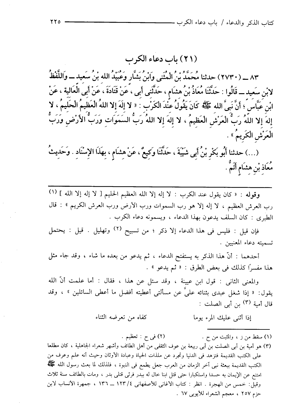 83 - (2730) حدثنا مُحَمَّدُ بْنُ الْمُثَنى وَابْنُ بَشَّارٍ وَعُبَيْدُ اللهِ بْنُ سَعِيدٍ - وَاللَّفْظُ لابْنِ سَعِيدٍ - قَالُوا: حَدَّثَنَا مُعَاذُ بْنُ هِشَامٍ، حَدَّثَنِى أَبِى، عَنْ قَتَادَةَ، عَنْ أَبِى الْعَالِيِة، عَنْ ابْنِ عَبَّاسٍ؛ أَنَّ نَبِىَّ اللهِ صَلَّى اللَّهُ عَلَيْهِ وَسَلَّمَ كَانَ يَقُولُ عِنْدَ الْكَرْبِ: " لا إِلَهَ إِلا اللهُ الْعَظِيمُ الْحَلِيمُ، لا إِلهَ إِلا اللهُ رَبُّ الْعَرْشِ الْعَظِيمُ، لا إِلهَ إِلا اللهُ رَبُّ السَمَاوَاتِ وَرَبُّ الأَرْضِ ورَبُّ الْعَرْشِ الْكَرِيمُ ".