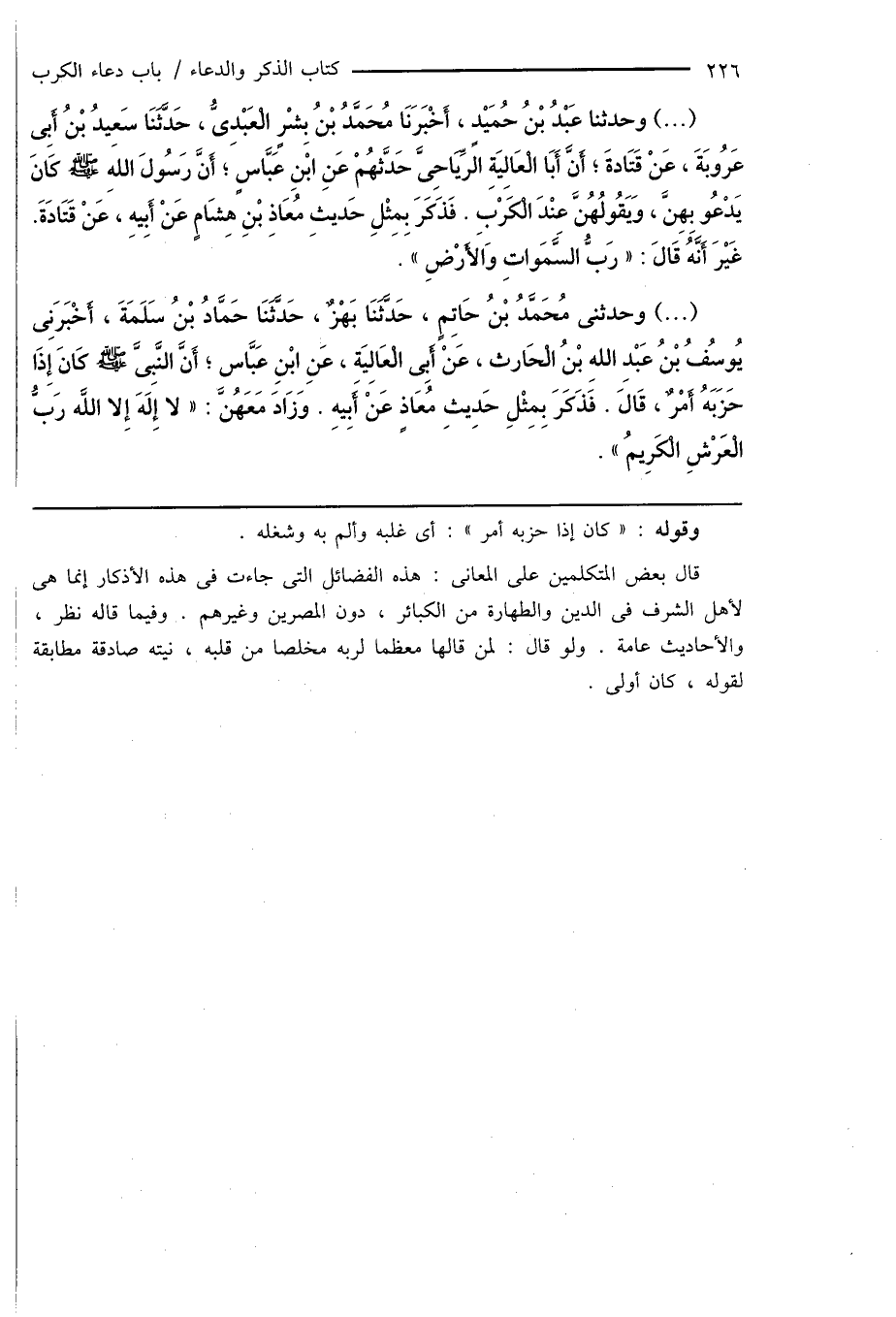 (...) وحدثنا عَبْدُ بْنُ حُمَيْدٍ، أَخْبَرَنَا مُحَمَّدُ بْنُ بِشْرٍ الْعَبْدِىُّ، حَدَّثَنَا سَعِيدُ بْنُ أَبِى عَرُوبَةَ، عَنْ قَتَادةَ؛ أَنَّ أَبَا الْعَالِيَةِ الرِّيَاحِىَّ حَدَّثهُمْ عَنِ ابْنِ عَبَّاسٍ؛ أَنَّ رَسُولَ اللهِ صَلَّى اللَّهُ عَلَيْهِ وَسَلَّمَ كَانَ يَدْعُو بِهِنَّ، وَيَقُولُهُنَّ عِنْدَ الْكَرْبِ. فَذَكَرَ بِمِثْلِ حَدِيثِ مُعَاذِ بْنِ هِشَامٍ عَنْ أَبِيهِ، عَنْ قَتَادَةَ. غَيْرَ أَنَّهُ قَالَ: " رَبُّ السَّمَاواتِ وَالأَرْضِ ".