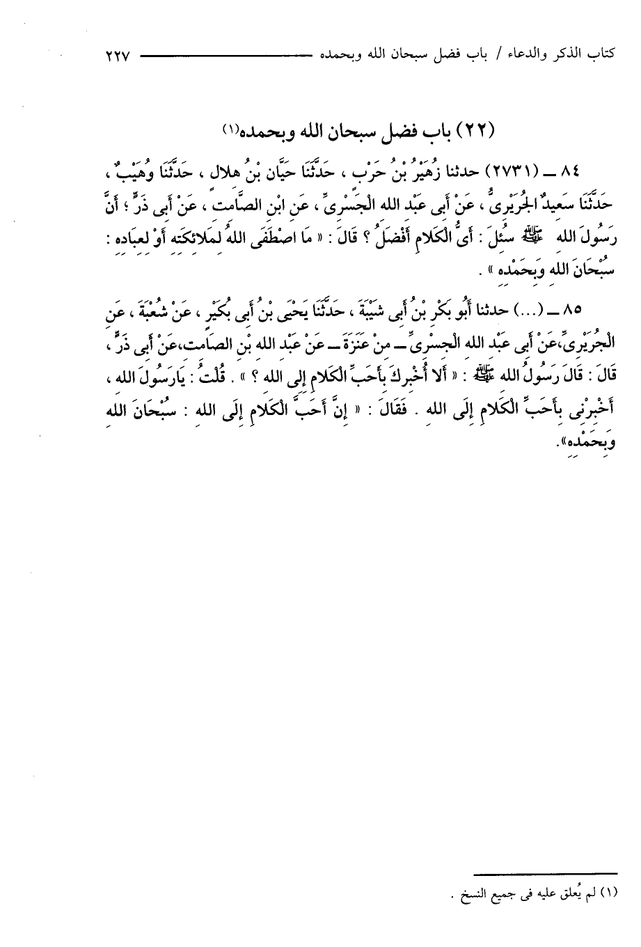 84 - (2731) حدثنا زُهَيْرُ بْنُ حَرْبٍ، حَدَّثَنَا حَيَّان بْنُ هِلالٍ، حَدَّثَنَا وُهَيْبٌ، حَدَّثَنَا سَعِيدٌ الجُرَيْرِىُّ، عَنْ أَبِى عَبْدِ اللهِ الْجسْرِىِّ، عَنِ ابْنِ الصَّامِتِ، عَنْ أَبِى ذَرٍّ؛ أَنَّ رَسُولَ اللهِ صَلَّى اللَّهُ عَلَيْهِ وَسَلَّمَ سُئِلَ: أىُّ الْكَلامِ أَفْضَلُ؟ قَالَ: " مَا اصْطَفَى اللهُ لِمَلائِكَتِهِ أَوْ لِعِبَادِهِ: سُبْحَانَ اللهِ وَبِحَمْدِهِ ".