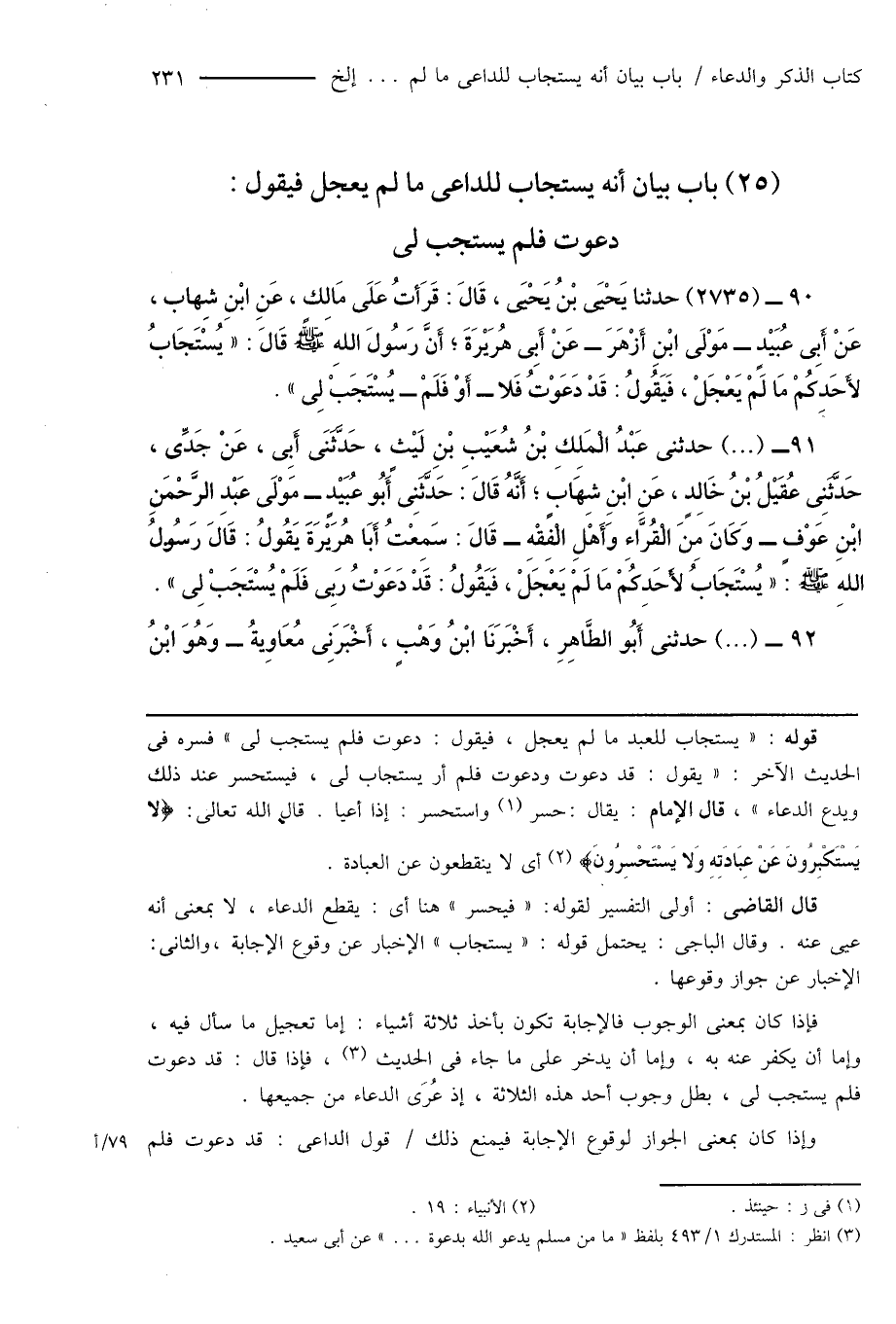 90 - (2735) حدثنا يَحْيَى بْنُ يَحْيَى، قَالَ: قَرَأتُ عَلَى مَالِكٍ، عَنِ ابْنِ شِهاب، عَنْ أَبِى عُبَيْدٍ - مَوْلَى ابْنِ أَزْهَرَ - عَنْ أَبِى هُرَيْرَةَ؛ أَنَّ رَسُولَ اللهِ صَلَّى اللَّهُ عَلَيْهِ وَسَلَّمَ قَالَ: " يُسْتَجَابُ لأَحَدِكُمْ مَا لَمْ يَعْجَلْ، فَيَقُولُ: قَدْ دَعَوْتُ فَلا - أَوْ فَلَمْ - يُسْتَجَبْ لِى ".