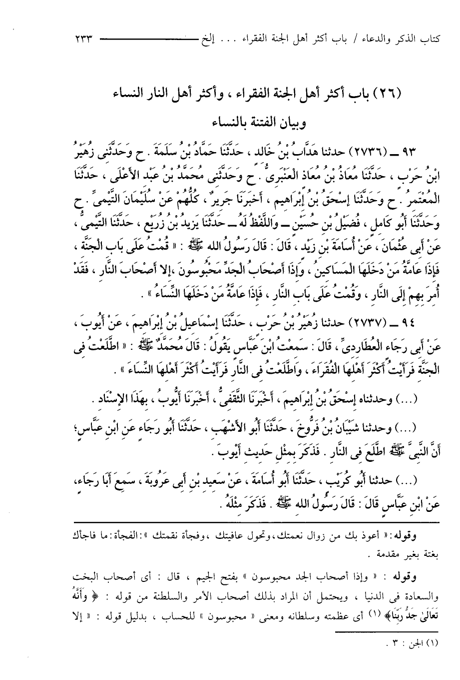 93 - (2736) حدثنا هَدَّابُ بْنُ خَالِدٍ، حَدَّثَنَا حَمَّادُ بْنُ سَلَمَةَ. ح وَحَدَّثَنِى زُهَيْرُ ابْنُ حَرْبٍ، حَدَّثَنَا مُعَاذُ بْنُ مُعَاذٍ الْعَنْبَرِىُّ. ح وَحَدَّثَنِى مُحَمَّدُ بْنُ عَبْدِ الأَعْلَى، حَدَّثَنَا الْمُعْتَمِرُ. ح وَحَدَّثَنَا إسْحَاقُ بْنُ إِبْرَاهِيم، أَخْبَرَنَا جَرِيرٌ، كُلُّهُمْ عَنْ سُلَيْمَانَ التَّيْمىِّ. ح وَحَدَّثَنَا أَبُو كَامِلٍ، فُضَيْلُ بْنِ حُسَيْنٍ - وَاللَّفْظُ لَهُ - حَدَّثَنَا يَزيدُ بْنُ زُرَيْع، حَدَّثَنَا التَّيْمىّ، عَنْ أَبِى عُثْمَانَ، عَنْ أُسَامَةَ بْنِ زَيْدٍ، قَالَ: قَالَ رَسُولُ اللهِ صَلَّى اللَّهُ عَلَيْهِ وَسَلَّمَ: " قُمْتُ عَلَى بَابِ الْجَنَّةِ، فَإِذَا عَامَّةُ مَنْ دَخَلَهَا الْمَسَاكِينُ، وَإِذَا أَصْحَابُ الْجَدِّ مَحْبُوسُونَ، إِلا أَصْحَابَ النَّارِ، فَقَدْ أُمِرَ بِهِمْ إِلَى النَّارِ، وَقُمْتُ عَلَى بَابِ النَّارِ، فَإِذَا عَامَّةُ مَنْ دَخَلَهَا النِّسَاءُ ".