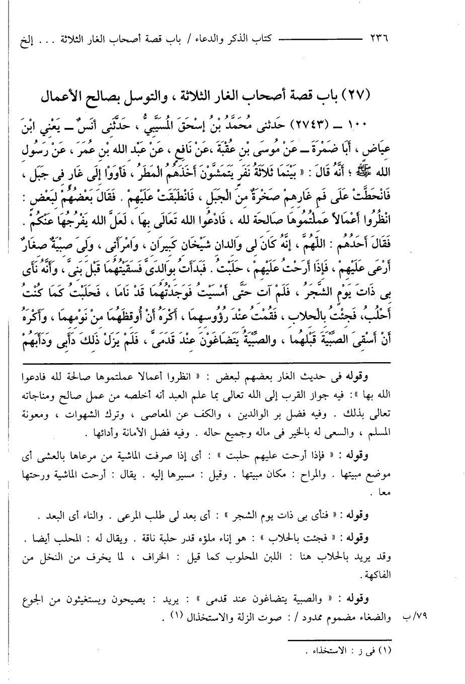 100 - (2743) حَدَّثَنِى مُحَمَّدُ بْنُ إسْحَاقَ المُسَيَّبِيُّ، حَدَّثَنِى أَنَسٌ - يَعْنِي ابْنَ عِيَاضٍ، أَبَا ضَمْرَةَ - عَنْ مُوسَى بْنِ عُقْبَةَ، عَنْ نَافِعٍ، عَنْ عَبْدِ الله بْنِ عُمَرَ، عَنْ رَسُولِ الله صَلَّى اللَّهُ عَلَيْهِ وَسَلَّمَ، أَنَّهُ قَالَ: " بَيْنَمَا ثَلاَثَةُ نَفَرٍ يَتَمَشَّوْنَ أَخَذَهُمُ الْمَطَرُ، فَأوَوْا إِلَى غَارٍ فِى جَبَل، فَانْحَطَّتْ عَلَى فَمِ غَارِهِمْ صَخْرَةٌ مِنَ الْجَبَلِ، فَانْطَبَقَتْ عَلَيْهِمْ. فَقَالَ بَعْضُهُمْ لبَعْضٍ: انْظُرُوا أَعْمَالاً عَمِلْتُمُوهَا صَالِحَة لله، فَادْعُوا الله تَعَالَى بِهَا، لَعَلَّ الله يَفْرُجُهَا عَنْكُمْ. فَقَالَ أَحَدُهُم: اللَّهُمَّ، إنَّهُ كَانَ لِى وَالِدانِ شَيْخَانِ كَبِيرَانِ، وَامْرَأَتِى، وَلِىَ صِبْيَةٌ صِغَارٌ أَرْعَى عَلَيْهِمْ، فَإِذَا أَرَحْتُ عَلَيْهِمْ، حَلَبْتُ. فَبَدَأَتُ بِوَالِدَىَّ فَسَقَيْتُهُمَا قَبْلَ بَنِىَّ، وَأَنَّهُ نَأَى بِى ذَاتَ يَوْمٍ الشَّجَرُ، فَلَمْ آتِ حَتَّى أَمْسَيْتُ فَوَجَدْتُهُمَا قَدْ نَامَا، فَحَلَبْتُ كَمَا كُنْتُ أَحْلُبُ، فَجئْتُ بالْحِلابِ، فَقُمْتُ عِنْدَ رُؤُوسِهِمَا، أَكْرَهُ أَنْ أُوقِظَهُمَا مِنْ نَوْمِهِمَا، وَأَكْرَهُ أَنْ أَسْقِىَ اَلصِّبْيَةَ قَبْلهُما، والصِّبْيَةُ يَتَضَاغَوْنَ عِنْدَ قَدَمَىَّ، فَلَمْ يَزَلْ ذَلِكَ دَأَبِى وَدَأَبَهُمْ