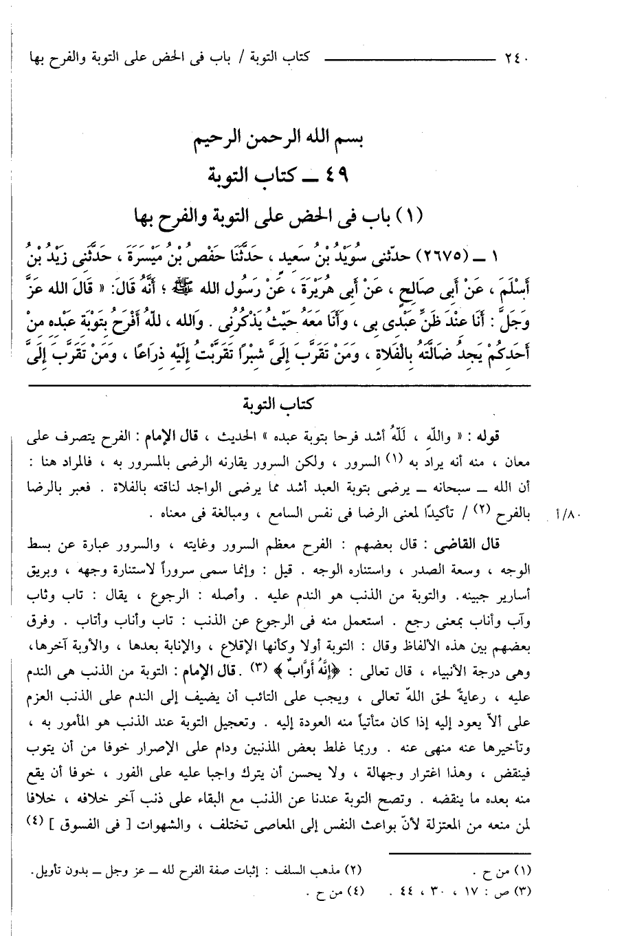 قال القاضى: قال بعضهم: الفرح معظم السرور وغايته، والسرور عبارة عن بسط الوجه، وسعة الصدر، واستناره الوجه. قيل: وإنما سمى سروراً لاستنارة وجهه، وبريق أسارير جبينه. والتوبة من الذنب هو الندم عليه. وأصله: الرجوع، يقال: تاب وثاب وآب وأناب بمعنى رجع. استعمل منه فى الرجوع عن الذنب: تاب وأناب وأتاب. وفرق بعضهم بين هذه الألفاًظ وقال: التوبة أولاً وكأنها الإقلاع، والإنابة بعدها، والأوبة آخرها، وهى درجة الأنبياء، قال تعالى: {إِنَّهُ أَوَّابٌ} (¬3). قال الإمام: التوبة من الذنب هى الندم عليه، رعايةً لحق الله تعالى، ويجب على التائب أن يضيف إلى الندم على الذنب العزم على ألاّ يعود إليه إذا كان متأتياً منه العودة إليه. وتعجيل التوبة عند الذنب هو المأمور به، وتأخيرها عنه منهى عنه. وربما غلط بعض المذنبين ودام على الإصرار خوفاً من أن يتوب فينقض، وهذا اغترار وجهالة، ولا يحسن أن يترك واجباً عليه على الفور، خوفاً أن يقع منه بعده ما ينقضه. وتصح التوبة عندنا عن الذنب مع البقاء على ذنب آخر خلافه، خلافاً لمن منعه من المعتزلة لأنّ بواعث النفس إلى المعاصى تختلف، والشهوات [فى الفسوق] (¬4)