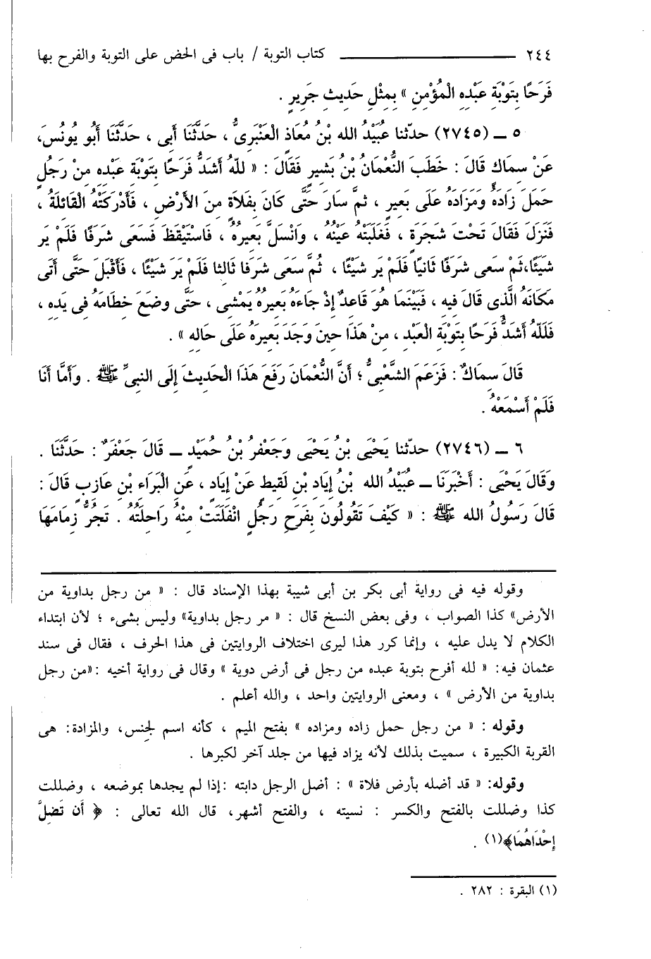 6 - (2746) حدّثنا يَحْيَى بْنُ يَحْيَى وَجَعْفرُ بْنُ حُمَيْدٍ - قَالَ جَعْفَرٌ: حَدَّثَنَا. وَقَالَ يَحْيَى: أَخْبَرَنَا - عُبَيْدُ الله بْنُ إِيَادِ بْنِ لَقِيط عَنْ إِيَادٍ، عَنِ الْبَرَاءِ بْنِ عَازِبٍ قَالَ: قَالَ رَسُولُ الله صَلَّى اللَّهُ عَلَيْهِ وَسَلَّمَ: " كَيْفَ تَقُولُونَ بِفَرَحِ رَجُلٍ انْفَلَتَتْ مِنْهُ رَاحِلَتُهُ. تَجُرُّ زِمَامَهَا