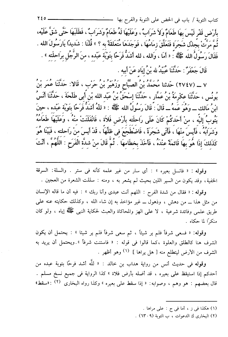 7 - (2747) حدّثنا مُحَمَّدُ بْنُ الصَّبَّاحِ وَزُهَيْرُ بْنُ حَرْبٍ، قَالا: حَدَّثَنَا عُمَر بْنُ يُونُس، حَدَّثَنَا عِكْرِمَةُ بْنُ عَمَّارٍ، حَدَّثَنَا إِسْحَاقُ بْنُ عَبْدِ الله بْنِ أَبِى طَلْحَةَ، حَدَّثَنَا أَنَسُ ابْنُ مَالِكٍ - وَهُوَ عَمهُ - قَالَ: قَالَ رَسُولُ الله صَلَّى اللَّهُ عَلَيْهِ وَسَلَّمَ: " للهُ أَشَدُّ فَرَحًا بِتَوْبَةِ عَبْدِهِ، حِينَ يَتُوبُ إِليْهِ، مِنْ أَحَدِكُمْ كَانَ عَلَى رَاحِلَتِهِ بِأَرْضِ فَلاَةٍ، فَانْفَلَتَتْ مِنْهُ، وَعَلَيْهَا طَعَامُهُ وَشَرَابُهُ، فَأَيِسَ مِنْهَا، فَأَتَى شَجَرَةً، فَاضْطَجَعَ فِى ظِلِّهَا، قَدْ أَيسَ مِنْ رَاحِلتِهِ، فَبَيْنَا هُوَ كَذَلِكَ إِذَا هُوَ بِهَا قَائمَةً عِنْدَهُ، فَأَخَذَ بِخِطَامِهَا. ثُمَّ قَالَ مِنْ شِدَّةِ الْفَرَحِ: اَللَّهُمَّ، أَنْتَ