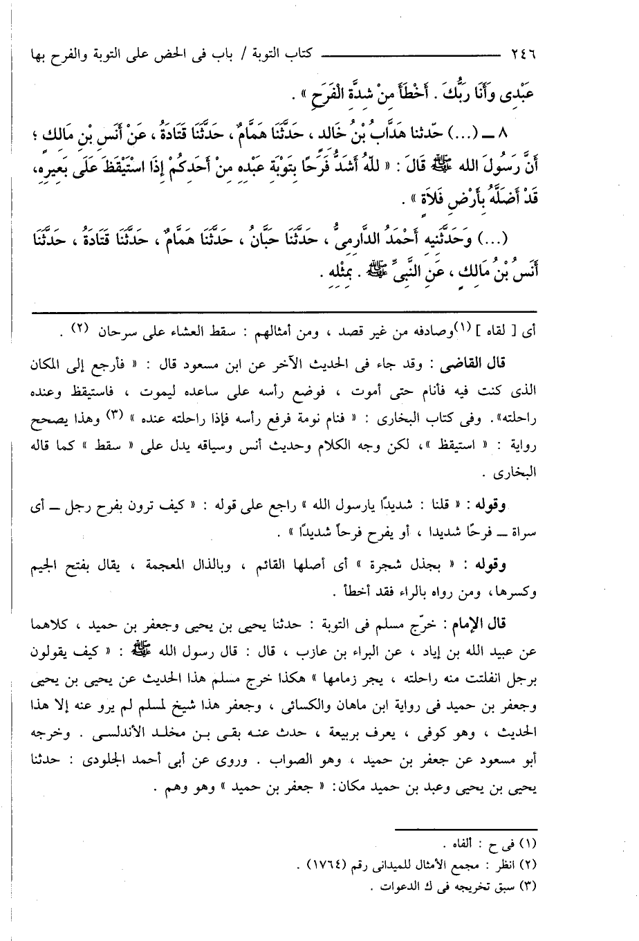 8 - (...) حدّثنا هَدَّابُ بْنُ خَالِدٍ، حَدَّثَنَا هَمَّامٌ، حَدَّثَنَا قَتَادَةُ، عَنْ أَنَسِ بْنِ مَالِكٍ، أَنَّ رَسُولَ الله صَلَّى اللَّهُ عَلَيْهِ وَسَلَّمَ قَالَ: " للهُ أَشَدُّ فَرَحًا بِتَوْبَةِ عَبْدِهِ مِنْ أَحَدِكُمْ إِذَا اسْتَيْقَظَ عَلَى بَعِيرِهِ، قَدْ أَضَلَّهُ بِأَرْضِ فَلاَةٍ ".