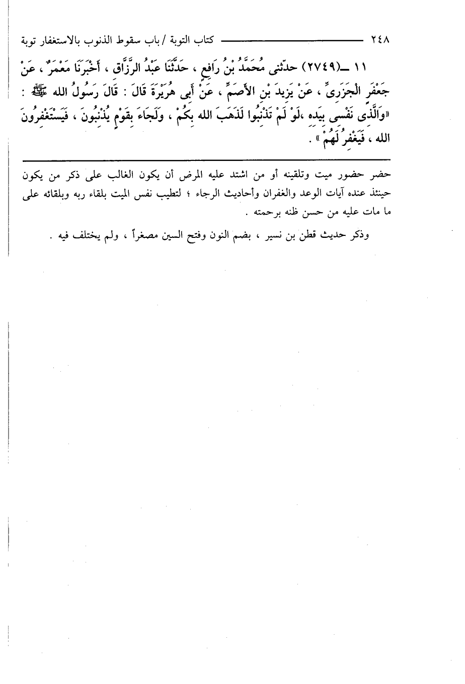 11 - (2749) حدّثنى مُحَمَّدُ بْنُ رَافِعٍ، حَدَّثَنَا عَبْدُ الرَّزَّاقِ، أَخْبَرَنَا مَعْمَرٌ، عَنْ جَعْفَرٍ الْجَزَرِىِّ، عَنْ يَزِيدَ بْنِ الأَصَمِّ، عَنْ أَبِى هُرَيْرَةَ قَالَ: قَالَ رَسُولُ الله صَلَّى اللَّهُ عَلَيْهِ وَسَلَّمَ: " وَالَّذِى نَفْسِى بِيَدِهِ، لَوْ لَمْ تَذْنِبُوا لَذَهَبَ الله بِكُمْ، وَلَجَاءَ بِقَوْمٍ يُذْنِبُونَ، فَيَسْتَغْفِرُونَ الله، فَيَغْفِرُ لَهُمْ ".