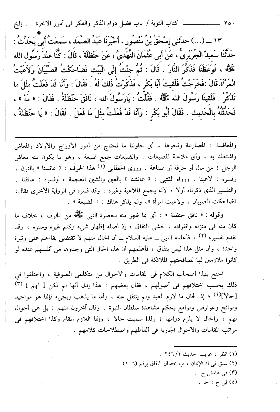 13 - (...) حدّثنى إِسْحَاقُ بْنُ مَنْصُورٍ، أَخْبَرَنَا عَبْدُ الصَّمَدِ، سَمِعْتُ أَبِى يَحَدِّثُ: حَدَّثَنَا سَعِيدٌ الْجُرَيْرِىُّ، عَنْ أَبِى عُثْمَانَ النَّهْدِىِّ، عَنْ حَنْظَلَةَ، قَالَ: كُنَّا عِنْدَ رَسُولِ الله صَلَّى اللَّهُ عَلَيْهِ وَسَلَّمَ، فَوَعَظَنَا فَذَكَّرَ النَّارَ. قَالَ: ثُمَّ جِئْتُ إِلَى الْبَيْتِ فَضَاحَكْتُ الصِّبْيَانَ وَلاَعَبْتُ الْمَرْأَةَ. قَالَ: فَخَرَجْتُ فَلَقِيتُ أَبَا بَكْرٍ، فَذَكَرْتُ ذَلِكَ لَهُ. فَقَالَ: وَأَنَا قَدْ فَعَلْتُ مِثْلَ ما تَذْكُرُ. فَلَقِينَا رَسُولَ الله صَلَّى اللَّهُ عَلَيْهِ وَسَلَّمَ. فَقُلْتُ: يَا رَسُولَ الله، نَافَقَ حَنْظَلَةُ. فَقَالَ: " مَهْ "، فَحَدَّثْتُهُ بِالْحَدِيثِ. فَقَالَ أَبُو بَكْرٍ: وَأَنَا قَدْ فَعَلْتُ مِثْلَ مَا فَعَلَ. فَقَالَ: " يَا حَنْظَلَةُ،