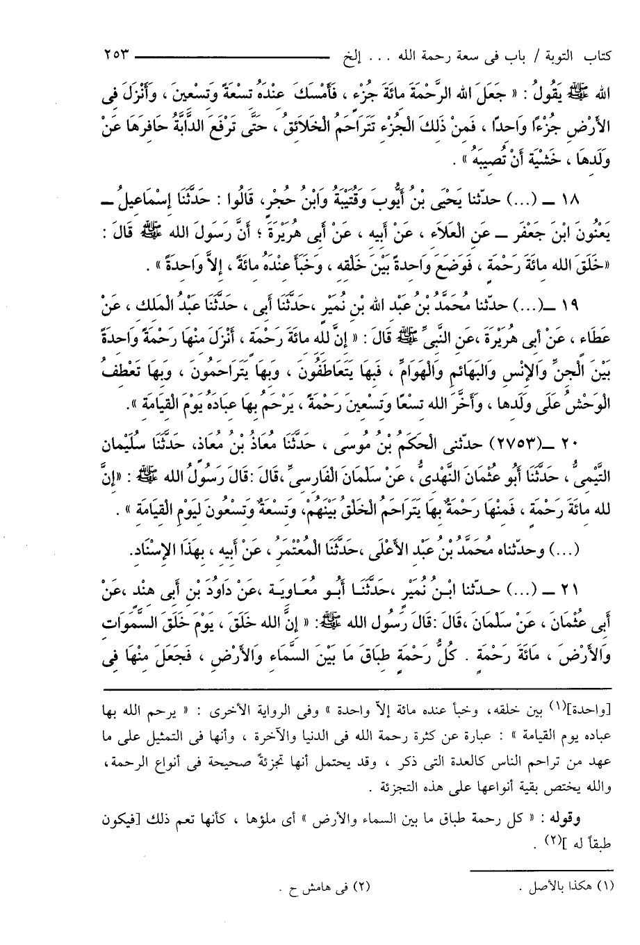 21 - (...) حدّثنا ابْنُ نُمَيْرٍ، حَدَّثَنَا أَبُو مُعَاوِيَة، عَنْ دَاوُدَ بْنِ أَبِى هِنْدٍ، عَنْ أَبِى عُثْمَانَ، عَنْ سَلْمَانَ، قَالَ: قَالَ رَسُول الله صَلَّى اللَّهُ عَلَيْهِ وَسَلَّمَ: " إِنَّ الله خَلَقَ، يَوْمَ خَلَقَ السَّمَاوَاتِ وَالأَرْضَ، مائَةَ رَحْمَةٍ. كُلُّ رَحْمَةٍ طِبَاقَ مَا بَيْنَ السَّمَاءِ وَالأَرْضِ، فَجَعَلَ مِنْهَا فِى