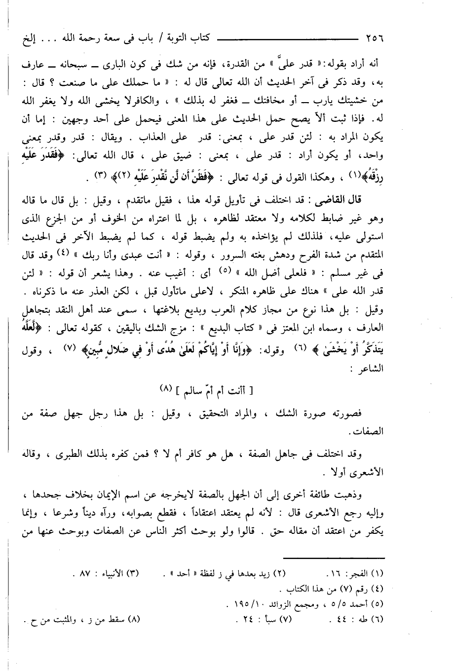 أنه أراد بقوله: " قدر علىَّ " من القدرة، فإنه من شك فى كون البارى - سبحانه - عارف به، وقد ذكر فى آخر الحديث أن الله تعالى قال له: " ما حملك على ما صنعت؟ قال: من خشيتك يارب - أو مخافتك - فغفر له بذلك "، والكافر لا يخشى الله ولا يغفر الله له. فإذا ثبت ألاّ يصح حمل الحديث على هذا المعنى فيحمل على أحد وجهين: إما أن يكون المراد به: لئن قدر على، بمعنى: قدر على العذاب. ويقال: قدر وقدر بمعنى واحد، أو يكون أراد: قدر على، بمعنى: ضيق على، قال الله تعالى: {فَقَدَرَ عَلَيْهِ رِزْقَهُ} (¬1)، وهكذا القول فى قوله تعالى: {فَظَنَّ أَن لَّن نَقْدِرَ عَلَيْهِ (¬2)} (¬3).