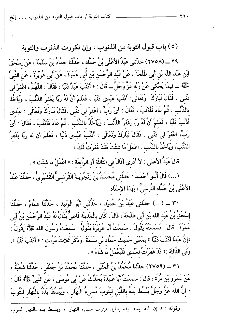 31 - (2759) حدّثنا مُحَمَّدُ بْنُ الْمُثَنّى، حَدَّثَنَا مُحَمَّدُ بْنُ جَعْفَرٍ، حَدَّثَنَا شُعْبَةُ، عَنْ عَمْرِو بْنِ مُرَّةَ، قَالَ: سَمِعْتُ أَبَا عُبَيْدَةَ يُحَدِّثُ عَنْ أَبِى مُوسَى، عَنِ النَّبِىِّ صَلَّى اللَّهُ عَلَيْهِ وَسَلَّمَ قَالَ: " إِنَّ الله عَزَّ وَجَلَّ يَبْسُط يَدهُ بِاللَّيْلِ لِيَتُوبَ مُسِىءُ النَّهَارِ، وَيَبْسُطُ يَدَهُ بِالنَّهَارِ لِيَتُوبَ
