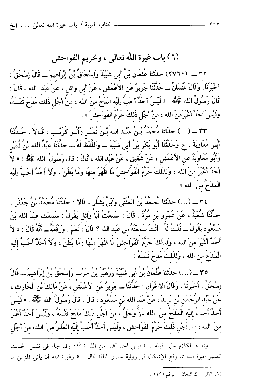 33 - (...) حدّثنا مُحَمَّدُ بْنُ عَبْدِ الله بْنُ نُمَيْرٍ وَأَبُو كُرَيْبٍ، قَالاَ: حَدَّثَنَا أَبُو مُعَاوِيَةَ. ح وَحَدَّثَنَا أَبُو بَكْرِ بْنُ أَبِى شَيْبَةَ - وَاللَّفْظ لَهُ - حَدَّثَنَا عَبْدُ الله بْنُ نُمَيْرٍ وَأَبُو مُعَاوِيَةَ عنِ الأَعْمَشِ، عَنْ شَقِيقٍ، عَنْ عَبْدِ الله، قَالَ: قَالَ رَسُولُ الله صَلَّى اللَّهُ عَلَيْهِ وَسَلَّمَ: " لاَ أَحَدٌ أَغْيَرَ مِنَ الله، وَلِذَلِكَ حَرَّمَ الْفَوَا حِشَ مَا ظَهَرَ مِنهَا وَمَا بَطَنَ، وَلاَ أَحَدٌ أَحَبَّ إِلَيْهِ الْمَدْحُ مِنَ الله ".