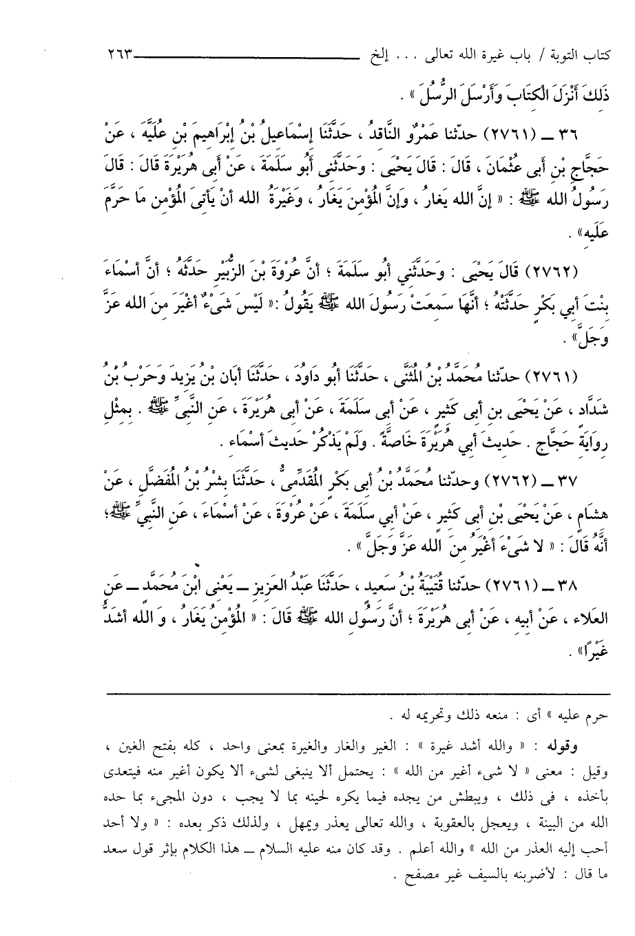 36 - (2761) حدّثنا عَمْرٌو النَّاقِدُ، حَدَّثَنَا إِسْمَاعِيلُ بْنُ إِبْرَاهِيمَ بْنِ عُلَيَّهَ، عَنْ حَجَّاجِ بْنِ أَبِى عُثْمَانَ، قَالَ: قَالَ يَحْيَى: وَحَدَّثَنِى أَبُو سَلَمَةَ، عَنْ أَبِى هُرَيْرَةَ قَالَ: قَالَ رَسُولُ الله صَلَّى اللَّهُ عَلَيْهِ وَسَلَّمَ: " إنَّ الله يَغارُ، وَإنَّ المُؤْمِنَ يَغَارُ، وَغَيْرَةُ الله أنْ يَأتِىَ المُؤْمِن مَا حَرَّمَ عَلَيهِ ".