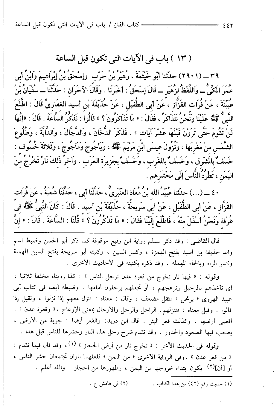 39 - (2901) حدّثنا أبْو خَيْثَمَةَ، زُهَيْرُ بْنُ حَرْبٍ وإسْحَاقُ بْنُ إبْرَاهِيمَ وَابْنُ أبِى عُمَرَ المَكِّىُّ - وَاللَّفْظُ لزُهَيْرٍ - قَالَ إسْحَاقُ: أَخْبَرَنَا. وَقَالَ الآخَرَانِ: حَدَّثَنَا - سُفْيَانُ بْنُ عُيَيْنَةَ، عَنْ فُرَاتٍ القَزَّازِ، عَنْ أبِى الطُّفَيْلِ، عَنْ حُذَيْفَةَ بْنِ أسيدٍ الغِفَارِىِّ قَالَ: اطَّلَعَ النَّبِىُّ صَلَّى اللَّهُ عَلَيْهِ وَسَلَّمَ عَلَيْنَا وَنَحْنُ نَتَذَاكَرُ، فَقَالَ: " مَا تَذَاكَرُونَ؟ " قَالُوا: نَذْكُرُ السَّاعَةَ. قَالَ: " إنَّهَا لَنْ تَقُومَ حَتَّى تَرَوْنَ قَبْلَهَا عَشْرَ آيَاتٍ ". فَذَكَرَ الدُّخَانَ، وَالدَّجَّالَ، وَالدَّابَّةَ، وَطُلُوعَ الشَّمْسِ مِنْ مَغْرِبَها، وَنُزُولَ عِيسَى ابْنَ مَرْيَمَ صَلَّى اللَّهُ عَلَيْهِ وَسَلَّمَ، وَيَأجُوجَ وَمَأجُوجَ، وَثَلاثَةَ خُسُوفٍ: خَسْفٌ بِالمَشْرِقِ، وَخَسْفٌ بِالمغْرِبِ، وَخَسْفٌ بِجَزِيرَةِ العَرَبِ. وَآخِرُ ذَلِكَ نَارٌ تَخْرُجُ مِنَ اليَمَنِ، تَطْرُدُ النَّاسَ إلَى مَحْشَرِهِم.