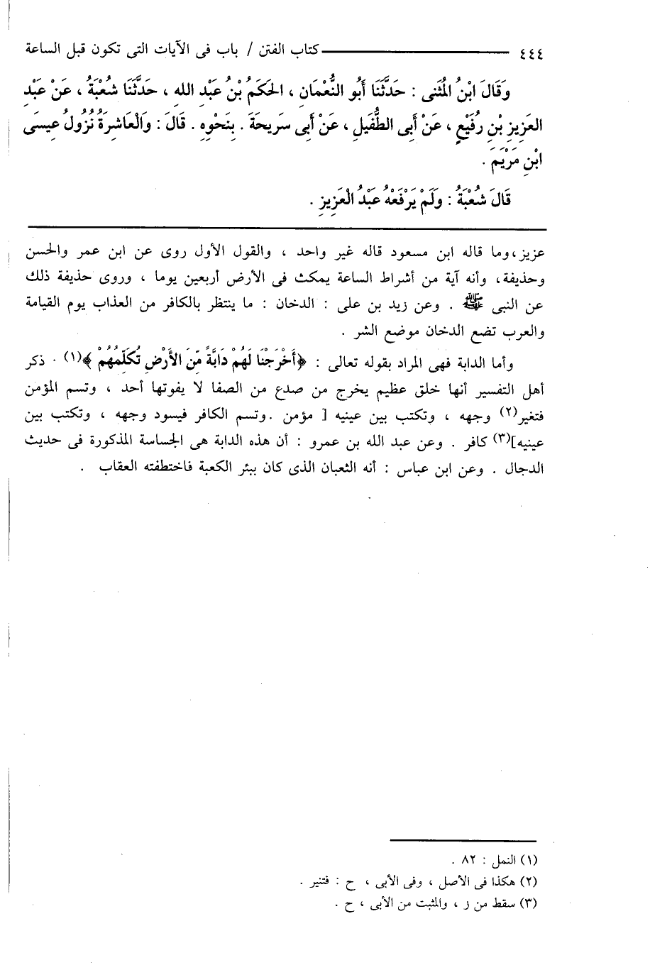 وَقَالَ ابْنُ المُثَنى: حَدَّثَنَا أَبُو النُّعْمَانِ، الحَكَمُ بْنُ عَبْدِ اللهِ، حَدَّثَنَا شُعْبَةُ، عَنْ عَبْدِ العَزِيزِ بْنِ رُفَيْعٍ، عَنْ أَبِى الطُّفَيلِ، عَنْ أَبِى سَريحَةَ. بِنَحْوِهِ. قَاَلَ: وَالْعَاشِرَةُ نُزُولُ عِيسَى ابْنِ مَرْيَمَ.