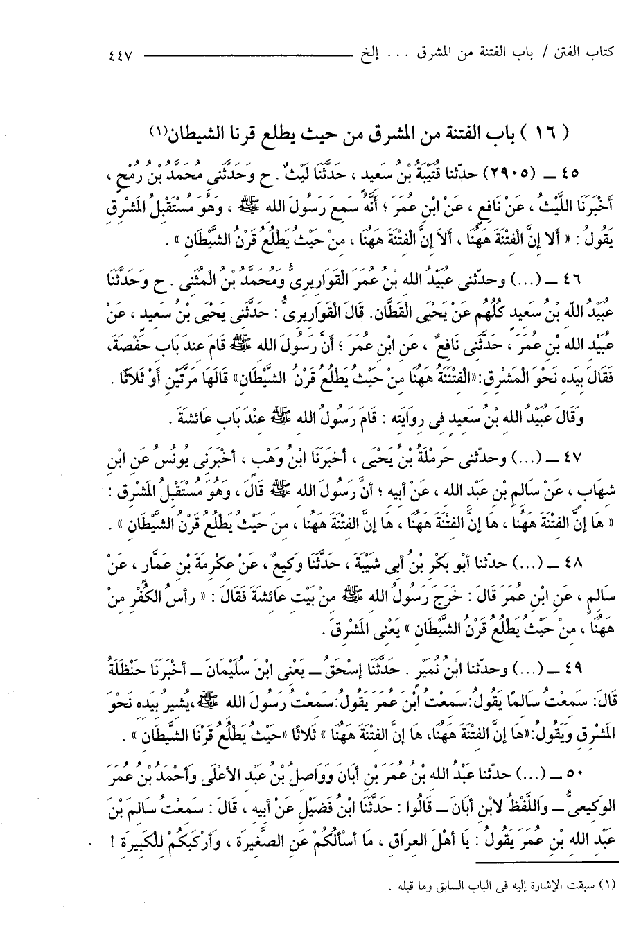 45 - (2905) حدّثنا قُتَيْبَةُ بْنُ سَعِيدٍ، حَدَّثَنَا لَيْثٌ. ح وَحَدَّثَنِى مُحَمَّدُ بْنُ رُمْحٍ، أَخْبَرَنَا اللَّيْثُ، عَنْ نَافِعٍ، عَنْ ابْنِ عُمَرَ؛ أَنَّهُ سَمِعَ رَسُولَ اللهِ صَلَّى اللَّهُ عَلَيْهِ وَسَلَّمَ، وَهُوَ مُسْتَقْبِلُ المَشْرِقِ يَقُولُ: " أَلا إِنَّ الْفِتْنَةَ هَهُنَا، أَلاَ إِنَّ الْفِتْنَةَ هَهُنَا، مِنْ حَيْثُ يَطْلُعُ قَرْنُ الشَّيْطَانِ ".