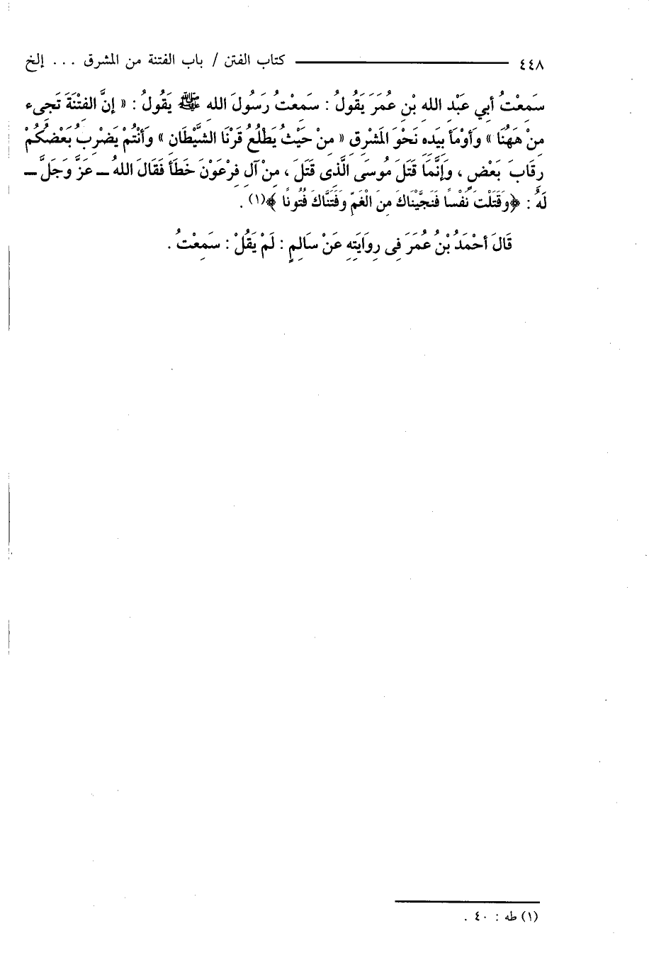 سَمِعْتُ أبِى عَبْدِ اللهِ بْنِ عُمَرَ يَقُولُ: سَمِعْتُ رَسُولَ اللهِ صَلَّى اللَّهُ عَلَيْهِ وَسَلَّمَ يَقُولُ: " إنَّ الفِتْنَةَ تَجِىء مِنْ هَهُنَا " وَأوْمَأَ بِيَدِهِ نَحْوَ المَشْرِقِ " مِنْ حَيْثُ يَطْلُعُ قَرْنَا الشَّيْطَانِ " وَأنْتُمْ يَضْرِبُ بَعْضُكُمْ رِقَابَ بَعْضٍ، وَإنَّمَا قَتَلَ مُوسَى الَّذِى قَتَلَ، مِنْ آلِ فِرْعَوْنَ خَطَأ فَقَالَ اللهُ - عَزَّ وَجَلَّ - لَهُ: {وَقَتَلْتَ نَفْسًا فَنَجَّيْنَاكَ مِنَ الْغَمِّ وَفَتَنَّاكَ فُتُونًا} (¬1).