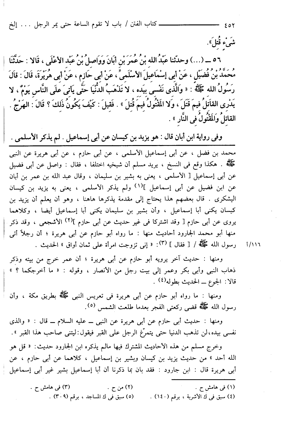 56 - (...) وحدّثنا عَبْدُ اللهِ بْنُ عُمَرَ بْنِ أبَانَ وَوَاصِلُ بْنُ عَبْدِ الأَعْلَى، قَالا: حَدَّثَنَا مُحَمَّدُ بْنُ فُضَيْلٍ، عَنْ أبِى إسْمَاعِيَلَ الأسْلَمِىِّ، عَنْ أبِى حَازِم، عَنْ أبِى هُرَيْرَةَ، قَالَ: قاَلَ رَسُولُ اللهِ صَلَّى اللَّهُ عَلَيْهِ وَسَلَّمَ: " وَالَّذِى نَفْسِى بِيَدِهِ، لا تَذْهَبُ الدُّنْيَا حَتَّى يَأتِىَ علَى النَّاسِ يَوْمٌ، لا يَدْرِى القاَتِلُ فِيمَ قَتَلَ، وَلا المَقْتُولُ فِيمَ قُتِلَ ". فَقِيلَ: كَيْفَ يَكُونُ ذَلِكَ؟ قَالَ: الهَرْجُ. القاتِلُ وَالمَقْتُولُ فِى النَّارِ ".