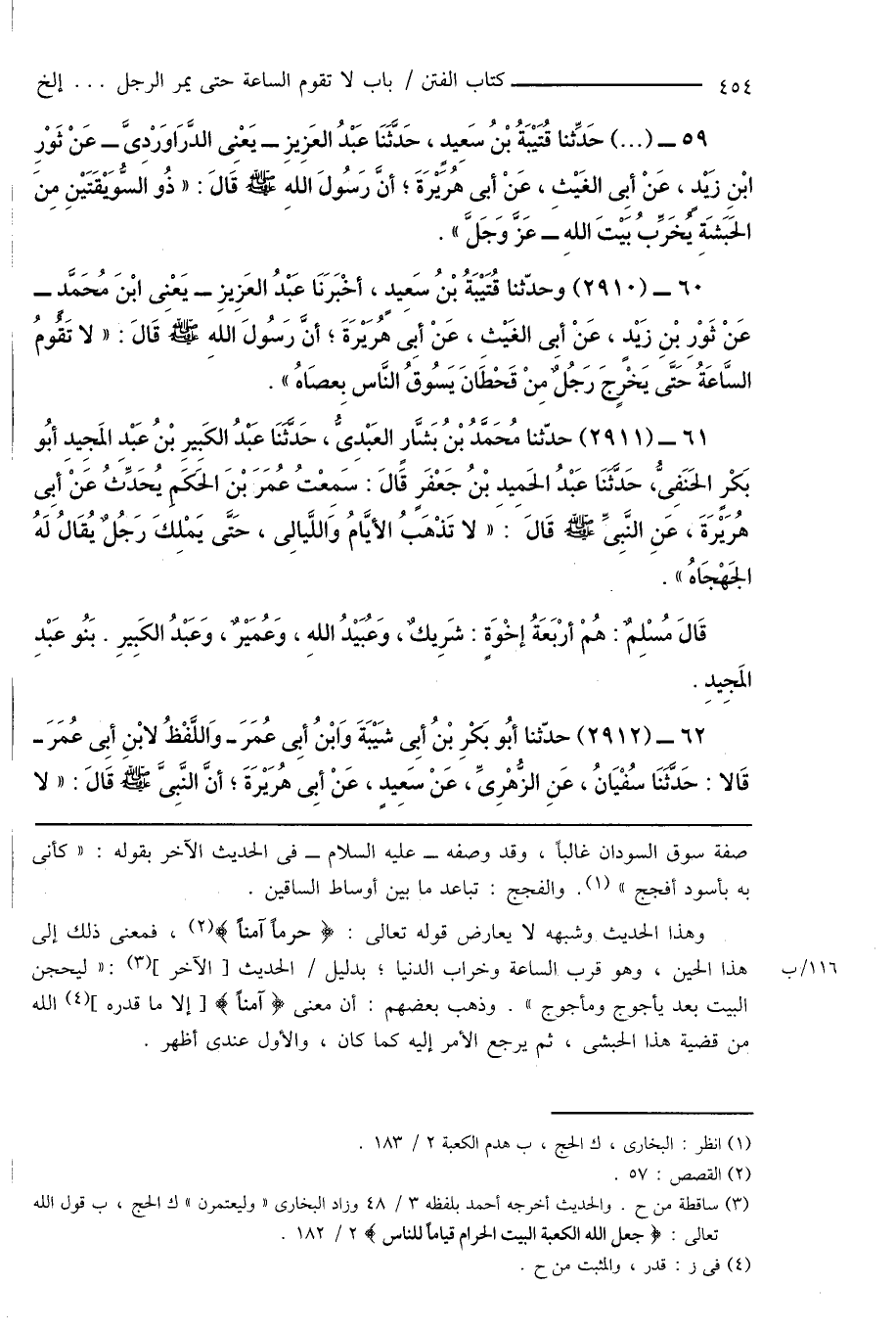 59 - (...) حَدِّثنا قُتَيْبَةُ بْنُ سَعِيدٍ، حَدَّثَنَا عَبْدُ العَزِيزِ - يَعْنِى الدَّرَاوَرْدِىَّ - عَنْ ثَوْرِ ابْنِ زَيْدٍ، عَنْ أبِى الغَيْثِ، عَنْ أبى هُرَيْرَةَ؛ أنَّ رَسُولَ اللهِ صَلَّى اللَّهُ عَلَيْهِ وَسَلَّمَ قَالَ: " ذُو السُّوَيْقَتَيْنِ مِنَ الحَبَشَةِ يُخَرِّبُ بَيْتَ اللهِ - عَزَّ وَجَلَّ ".