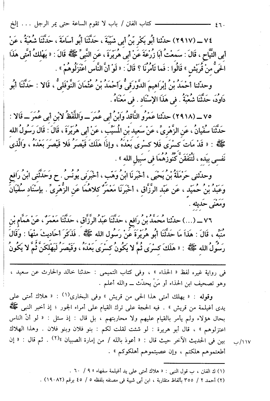 74 - (2917) حدّثنا أَبُو بَكْرِ بنُ أبِى شَيْبَةَ، حَدَّثَنَا أَبُو أسَامَةَ، حَدَّثَنَا شُعْبَةُ، عَنْ أبِى التَّيَّاحِ، قَالَ: سَمِعْتُ أَبَا زُرْعَةَ عَنْ أبِى هُرَيْرَةَ، عَنِ النَّبِىِّ صَلَّى اللَّهُ عَلَيْهِ وَسَلَّمَ قَالَ: " يَهْلِكُ أمَّتِى هَذَا الحَىُّ مِنْ قُرَيْشٍ " قَالُوا: فَما تَأمُرُنَا؟ قَالَ: " لَوْ أنَّ النَّاس اعْتَزَلُوهُمْ ".