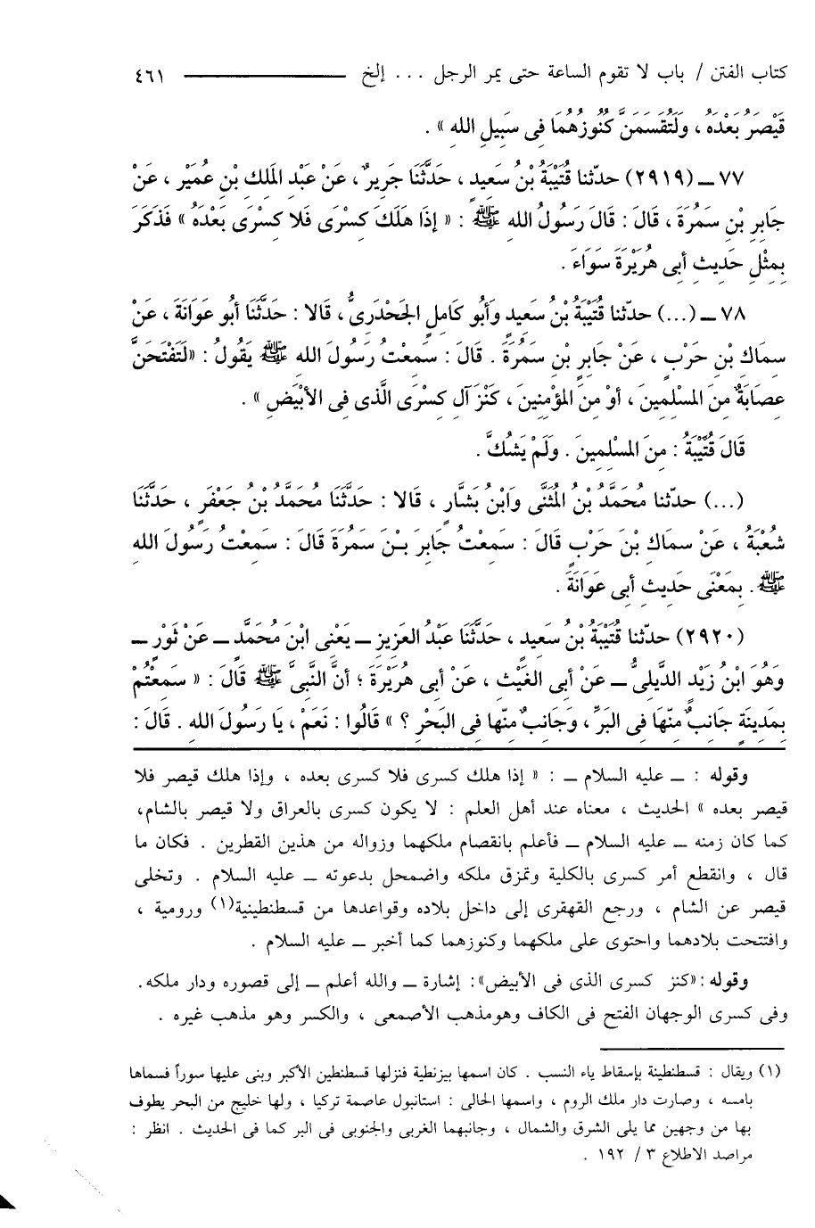 78 - (...) حدّثنا قُتَيْبَةُ بْنُ سَعِيدٍ وَأبُو كَامِلٍ الجَحْدَرِىُّ، قَالا: حَدَّثَنَا أَبُو عَوَانَةَ، عَنْ سِمَاكِ بْنِ حَرْبٍ، عَنْ جَابِرٍ بْنِ سَمُرَةَ. قَالَ. سَمِعْتُ رَسُولَ اللهِ صَلَّى اللَّهُ عَلَيْهِ وَسَلَّمَ يَقُولُ: " لَتَفْتَحَنَّ عِصَابَةٌ مِنَ المسْلِمِينَ، أوْ مِنَ المؤْمِنِينَ، كَنْزَ آلِ كِسْرَى الَّذى فِى الأبْيَضِ ".