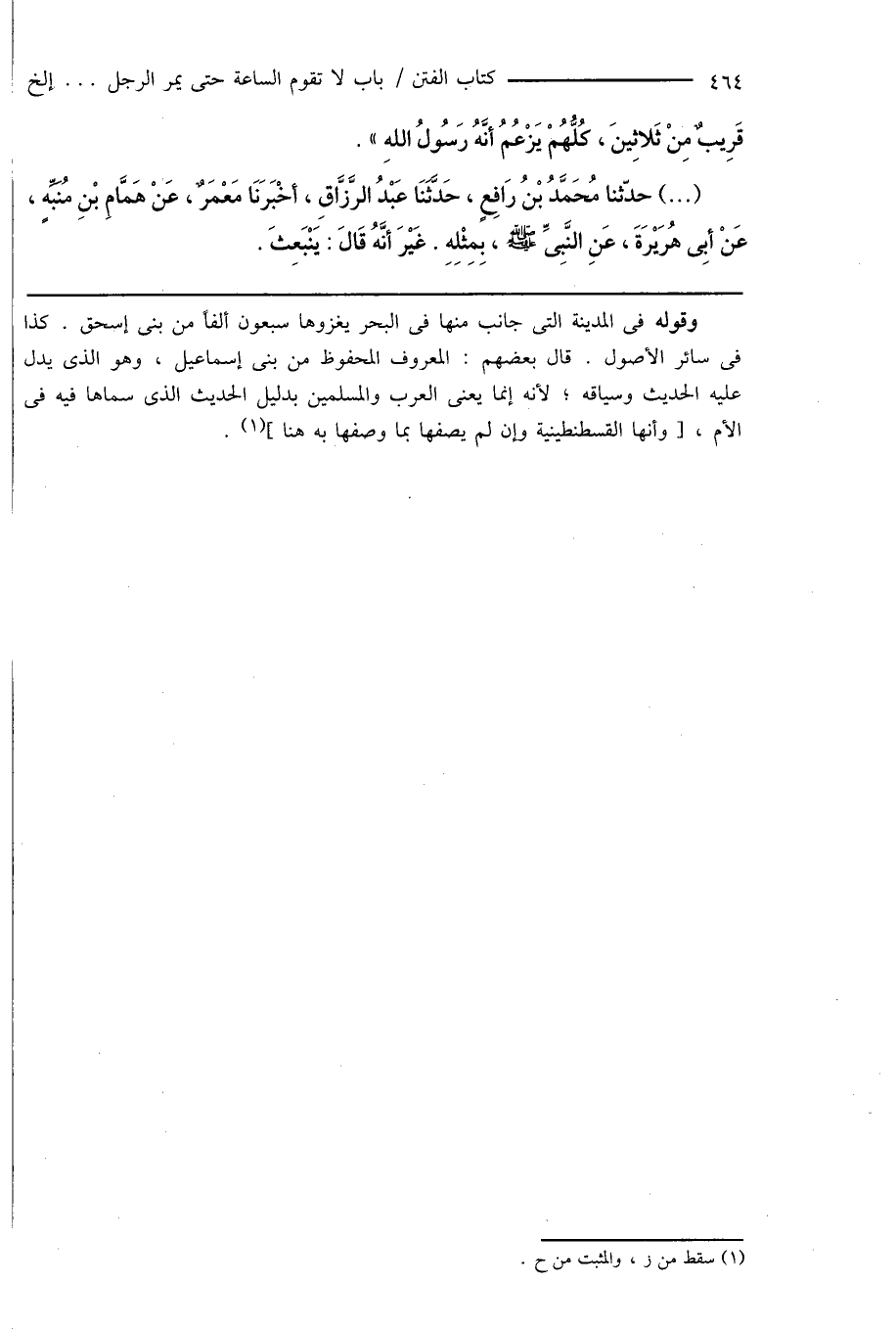 وقوله فى المدينة التى جانب منها فى البحر يغزوها سبعون ألفاً من بنى إسحاق. كذا فى سائر الأصول. قال بعضهم: المعروف المحفوظ من بنى إسماعيل، وهو الذى يدل عليه الحديث وسياقه، لأنه إنما يعنى العرب والمسلمين بدليل الحديث الذى سماها فيه فى الأم، [وأنها القسطنطينية وإن لم يصفها بما وصفها به هنا] (¬1).