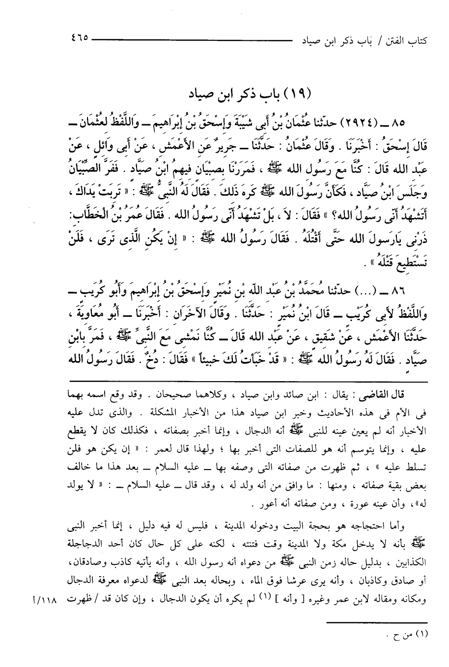 85 - (2924) حدّثنا عُثْمَانُ بْنُ أَبِى شَيْبَةَ وَإِسْحَاقُ بْنُ إِبْرَاهِيمَ - وَاللَّفْظُ لِعُثْمَانَ - قَالَ إِسْحَاقُ: أَخْبَرَنَا. وَقَالَ عُثْمَانُ: حَدَّثَنَا - جَرِيرٌ عَنِ الأَعْمَشِ، عَنْ أَبِى وَائِلٍ، عَنْ عَبْدِ الله قَالَ: كُنَّا مَعَ رَسُولِ الله صَلَّى اللَّهُ عَلَيْهِ وَسَلَّمَ، فَمَرَرْنَا بِصِبْيَانٍ فِيهِمُ ابْنُ صَيَّادٍ. فَفَرَّ الصِّبْيَانُ وَجَلَسَ ابْنُ صَيَّاد، فَكَانَّ رَسُولَ الله صَلَّى اللَّهُ عَلَيْهِ وَسَلَّمَ كَرهَ ذَلِكَ. فَقَالَ لَهُ النَّبِىُّ صَلَّى اللَّهُ عَلَيْهِ وَسَلَّمَ: " تَرِبَتْ يَدَاكَ، أَتَشْهَدُ أَنّى رَسُولُ الله؟ " فَقَالَ: لاَ، بَلْ تَشْهَدُ أَنّى رَسُولُ الله. فَقَالَ عُمَرُ بْنُ الْخَطاب: ذَرْنِى يَا رَسولَ الله حَتَّى أَقْتُلَهُ. فَقَالَ رَسُولُ الله صَلَّى اللَّهُ عَلَيْهِ وَسَلَّمَ: " إِنْ يَكُنِ الَّذِى نَرَى، فَلَنْ نَسْتَطِيعَ قَتْلَهُ ".