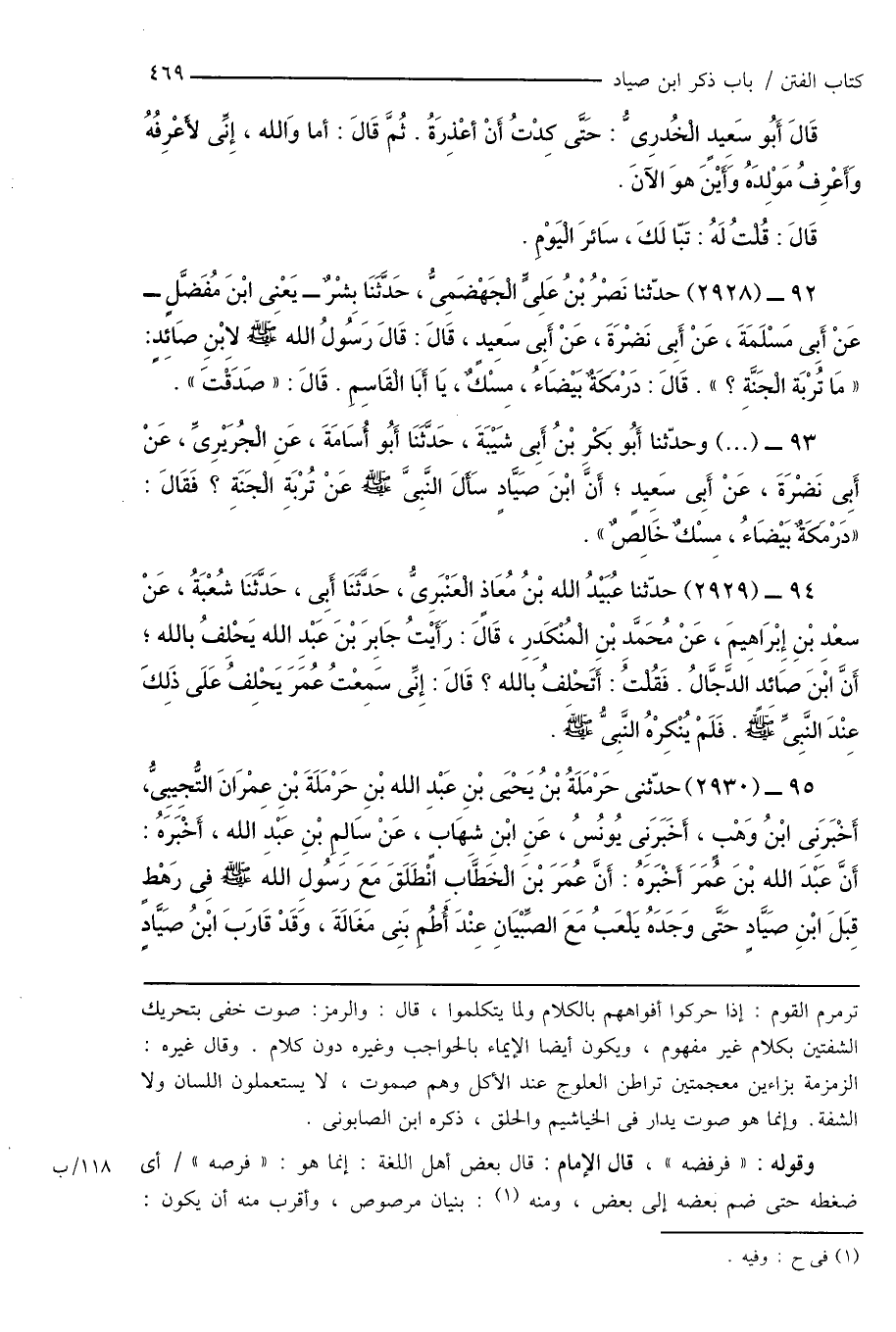 95 - (2930) حدّثنى حَرْمَلَةُ بْنُ يَحْيَى بْنِ عَبْدِ الله بْنِ حَرْمَلَةَ بْنِ عِمْرَانَ التُّجِيبِىُّ، أَخْبَرَنِى ابْنُ وَهْبٍ، أَخْبَرَنِى يُونُسُ، عَنِ ابْنِ شِهَابٍ، عَنْ سَالِمِ بْنِ عَبْدِ الله، أَخْبَرَهُ: أَنَّ عَبْدَ الله بْنَ عُمَرَ أَخْبَرَهُ: أَنَّ عُمَرَ بْنَ الْخَطَّاَبِ انْطَلَقَ مَعَ رسُولِ الله صَلَّى اللَّهُ عَلَيْهِ وَسَلَّمَ فِى رَهْطٍ قِبَلَ ابْنِ صَيَّادٍ حَتَّى وَجَدَهُ يَلْعَبُ مَعَ الصِّبْيَانِ عِنْدَ أُطُمِ بَنِى مَغَالَةَ، وَقَدْ قَارَبَ ابْنُ صَيَّادٍ