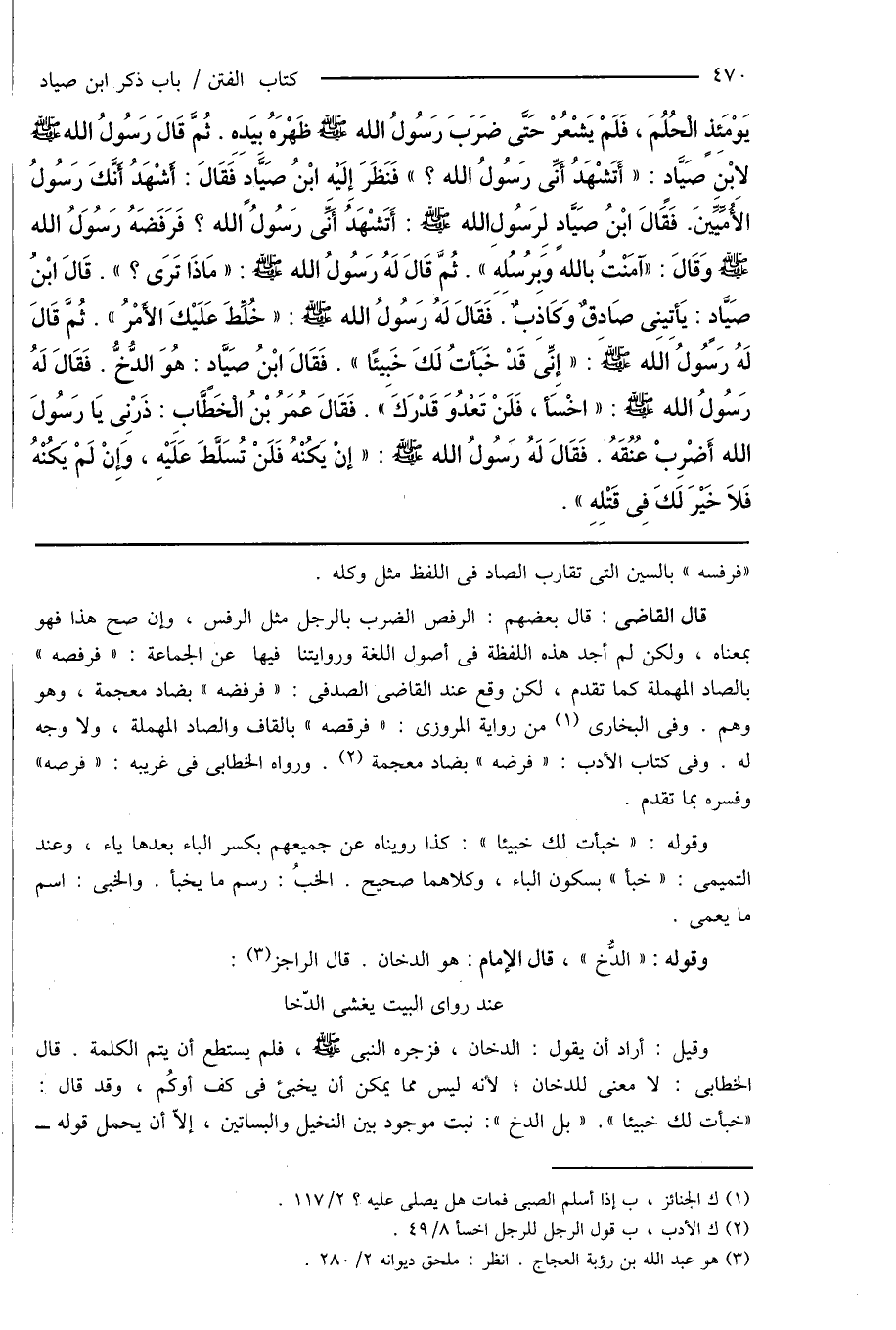 يَوْمَئِذٍ الْحُلُمَ، فَلَمْ يَشْعُرْ حَتَّى ضَرَبَ رَسُولُ الله صَلَّى اللَّهُ عَلَيْهِ وَسَلَّمَ ظَهْرَهُ بِيَدِهِ. ثُمَّ قَالَ رَسُولُ الله صَلَّى اللَّهُ عَلَيْهِ وَسَلَّمَ لابْنِ صَيَّادٍ: " أَتَشْهَدُ أَنِّى رَسُولُ الله؟ " فَنَظَرَ إِلَيْهِ ابْنُ صَيَّادٍ فَقَالَ: أَشْهَدُ أَنَّكَ رَسُولُ الأُمِّيِّينَ. فَقَالَ ابْنُ صَيَّادٍ لِرَسُولِ الله صَلَّى اللَّهُ عَلَيْهِ وَسَلَّمَ: أَتَشْهَدُ أَنِّى رَسُولُ الله؟ فَرَفَضَهُ رَسُوَلُ الله صَلَّى اللَّهُ عَلَيْهِ وَسَلَّمَ وَقَالَ: " آمَنْتُ بالله وَبِرُسُلِهِ ". ثُمَّ قَالَ لَهُ رَسُولُ الله صَلَّى اللَّهُ عَلَيْهِ وَسَلَّمَ: " مَاذَا تَرَى؟ ". قَالَ ابْنُ صَيَّادٍ: يَأتِينِى صَادِقٌ وَكَاذِبٌ. فَقَالَ لَهُ رَسُولُ الله صَلَّى اللَّهُ عَلَيْهِ وَسَلَّمَ: " خُلِّطَ عَلَيْكَ الأَمْرُ ". ثُمَّ قَالَ لَهُ رَسُولُ الله صَلَّى اللَّهُ عَلَيْهِ وَسَلَّمَ: " إِنِّى قَدْ خَبَأتُ لَكَ خَبِيئًا ". فَقَالَ ابْنُ صَيَّادٍ: هُوَ الدُّخُّ. فَقَالَ لَهُ رَسُولُ الله صَلَّى اللَّهُ عَلَيْهِ وَسَلَّمَ: " اخْسَأ، فَلَنْ تَعْدُوَ قَدْرَكَ ". فَقَالَ عُمَرُ بْنُ الْخَطَّابِ: ذَرْنِى يَا رَسُولَ الله أَضْرِبْ عُنُقَهُ. فَقَالَ لَهُ رَسُولُ الله صَلَّى اللَّهُ عَلَيْهِ وَسَلَّمَ: " إنْ يَكُنْهُ فَلَنْ تُسَلَّطَ عَلَيْهِ، وَإِنْ لَمْ يَكُنْهُ فَلاَ خَيْرَ لَكَ فِى قَتْلِهِ ".